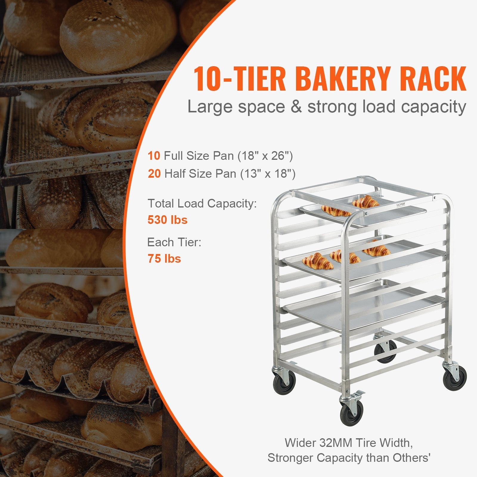 Bun Pan Rack, 10-Tier Commercial Bakery Racks with Brake Wheels, Aluminum Racking Trolley Storage for Half & Full Sheet, Speed Rack For Kitchen Home, Bread Baking Equipment, 660x515x985 mm