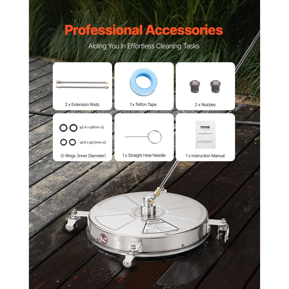 - Professional Accessories:This power washer surface cleaner comes with a variety of professional accessories, including hose connectors and an adapter kit for quicker assembly and immediate cleaning. Plus, a through-hole needle is included to easily solve any clogging issues.