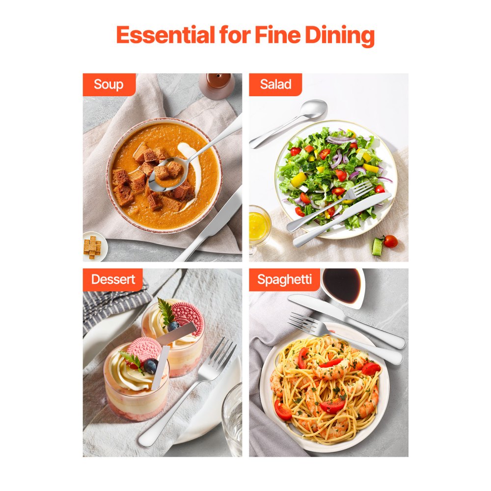 - 30-Piece Flatware Set: This silverware set includes 6 dinner forks, 6 dinner spoons, 6 dinner knives, 6 dessert forks, and 6 dessert spoons, making it an essential item for both home and restaurant use. Whether for everyday meals, dinner preparation, or parties, this flatware set is an indispensable dining tool