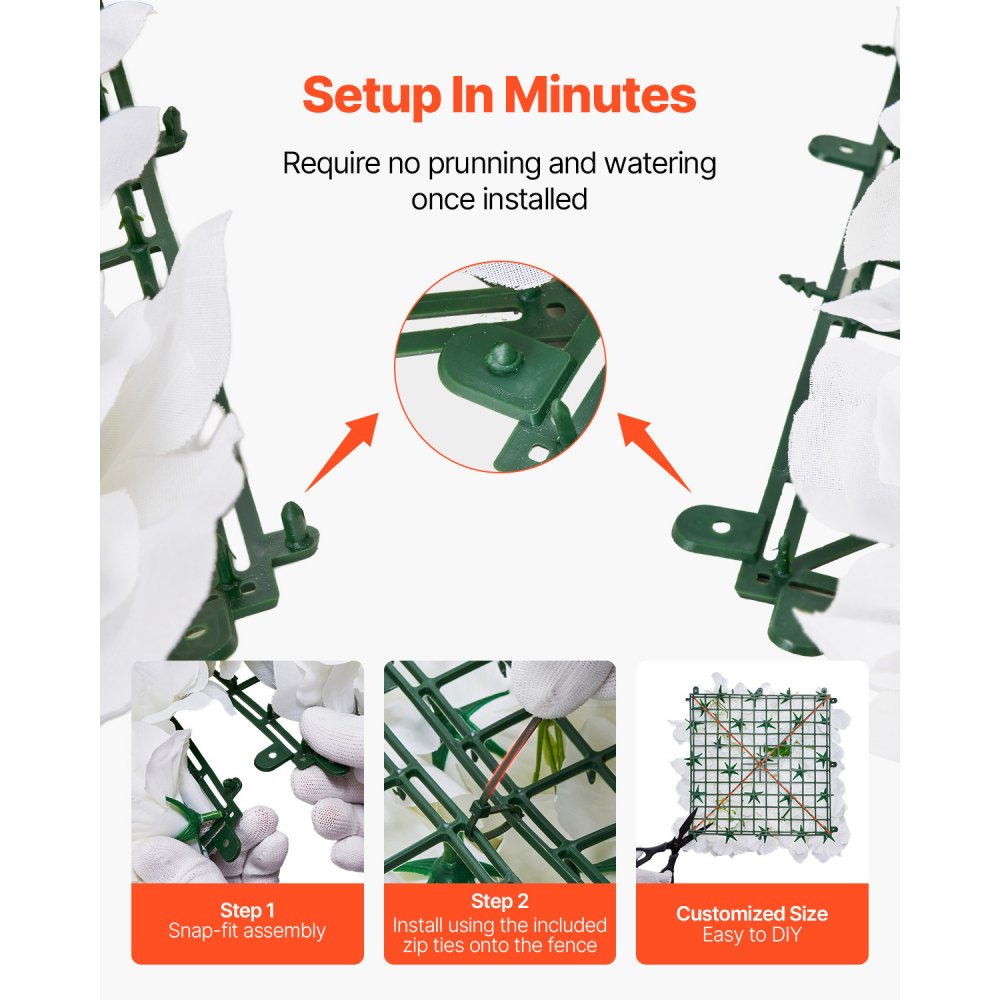 - Quick and Easy Installation: The interlocking snap system allows you to assemble your plant wall quickly and securely. Additionally, we include 200 complimentary zip ties to help you attach the panels firmly to fences or other surfaces. The plant wall is flexible and easily customizable, allowing you to cut and shape it to meet your specific DIY needs
