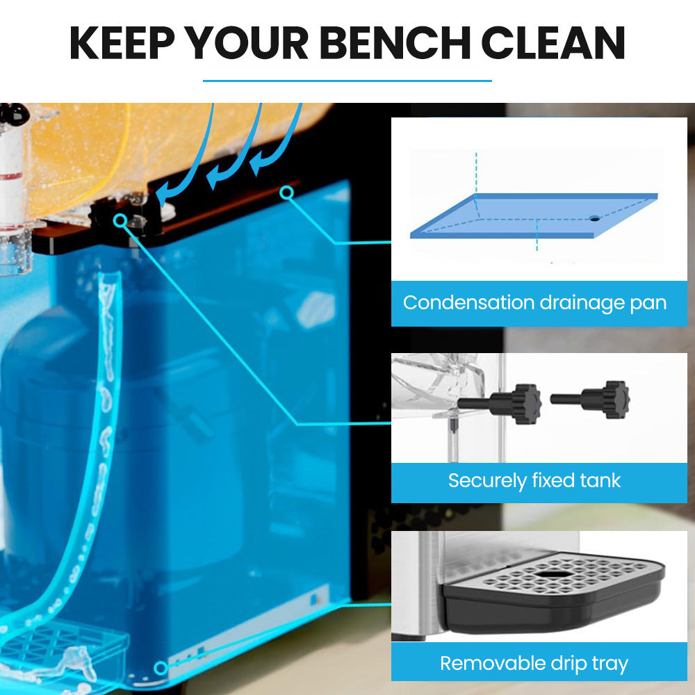 With the push of a button, the PolyCool 3L Slushie Machine’s self-cleaning function saves time and keeps maintenance low. A removable drip tray and condensation drainage pan make post-service clean-up fast and simple, keeping your workbench tidy even during peak times.