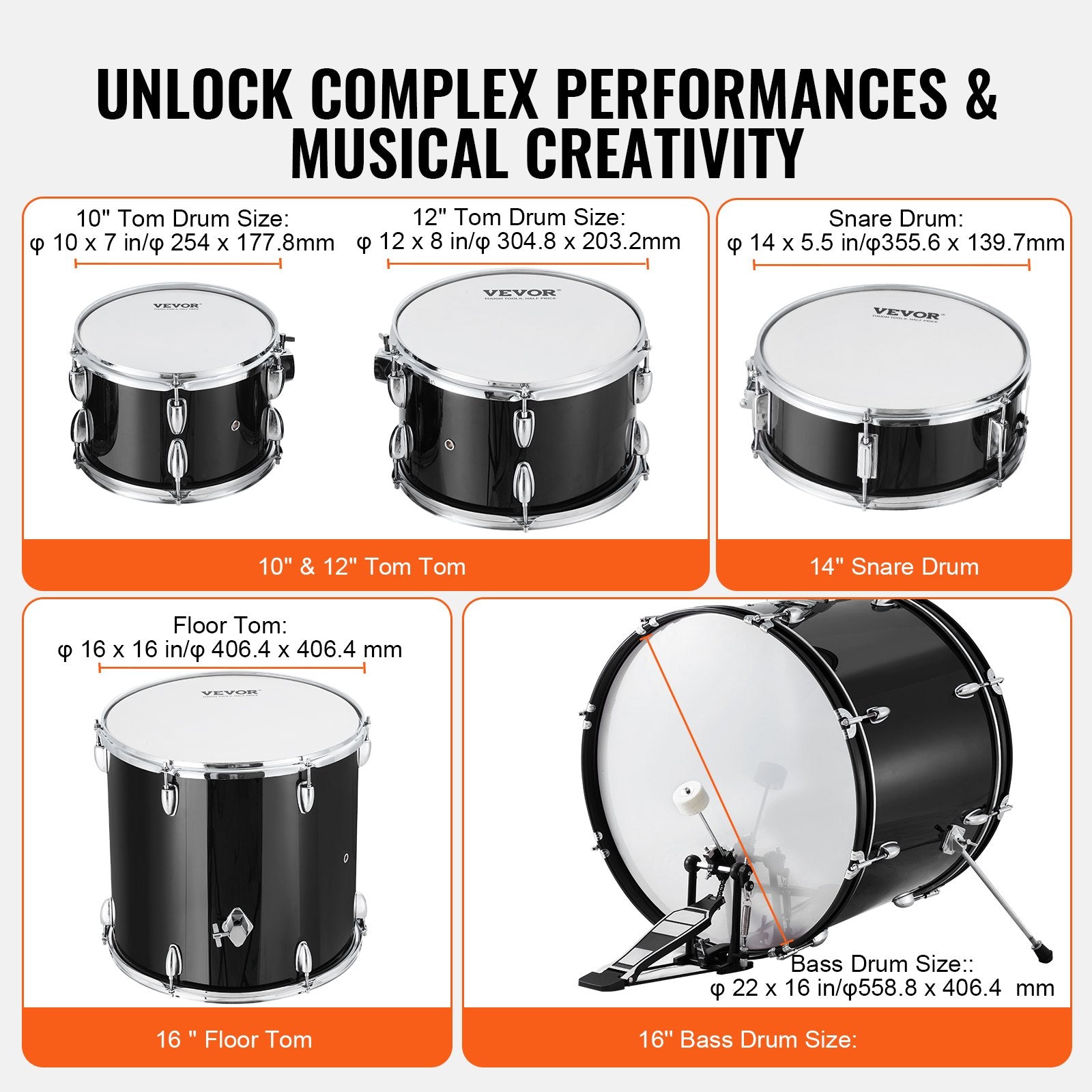 Adult Drum Set, 5-Piece, 558.8 mm Complete Full Size Drum Kit with Bass Toms Snare Floor Drum Adjustable Throne Stands Cymbal Hi-Hat Pedal and Drumsticks, Beginner Drum Kit for Adults, Black