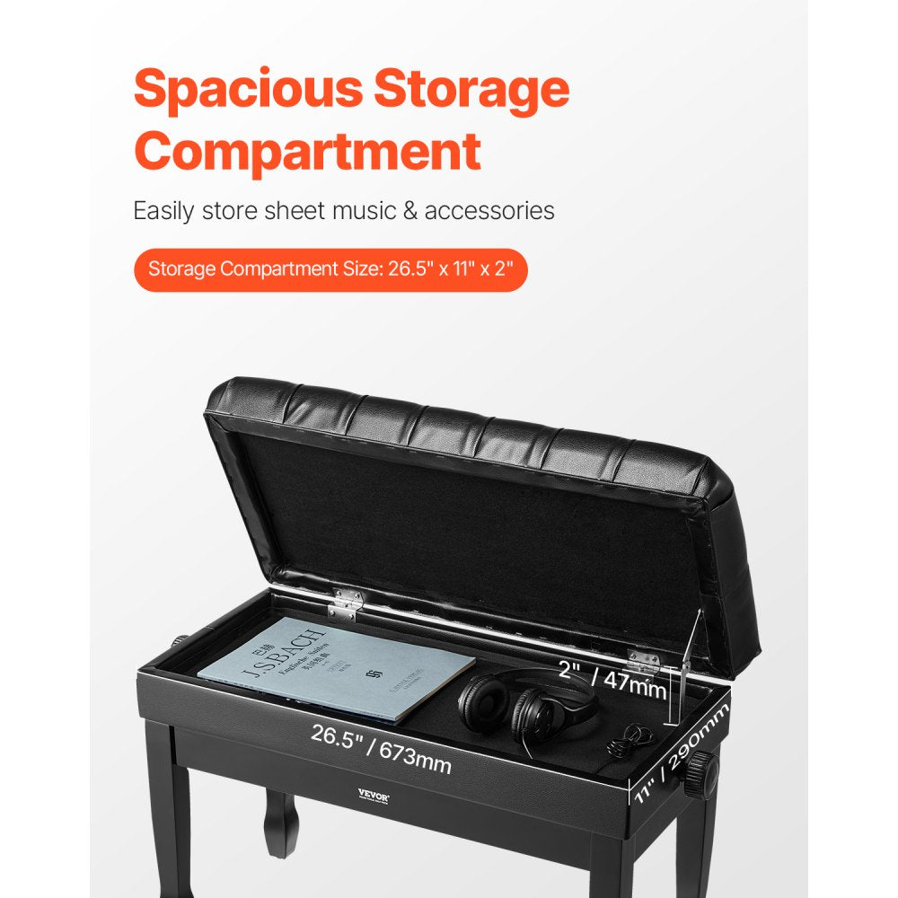 - Ample Storage Compartment: With a 26.5" x 11" x 2" storage compartment, this piano bench gives you generous space for storing sheet music, music accessories, or personal items. Keep your space clean and organized while having everything you need close at hand.