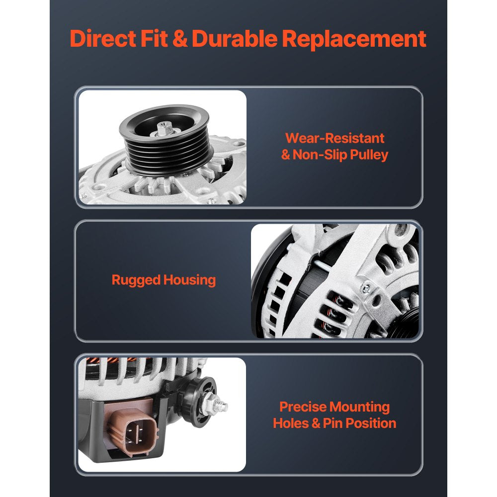 - Durable Materials: Our automotive replacement alternator is built with high-temp-resistant copper coils and a lightweight aluminum housing with cooling fan. This combo improves heat dissipation and conductivity while withstanding tough conditions