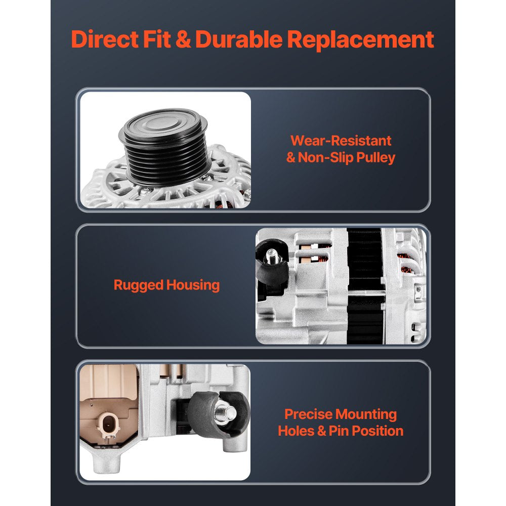 - Durable Materials: Our automotive replacement alternator is built with high-temp-resistant copper coils and a lightweight aluminum housing with cooling fan. This combo improves heat dissipation and conductivity while withstanding tough conditions