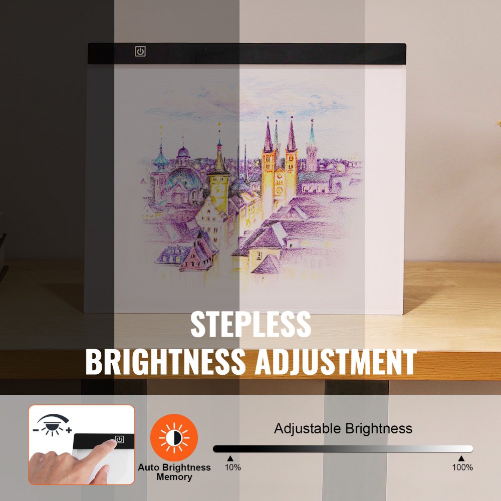- Stepless Brightness: You can press and hold for stepless brightness adjustment, allowing you to set an ideal drawing light board brightness for any environment and enhance eye comfort. The smart memory function conveniently remembers your last brightness setting.