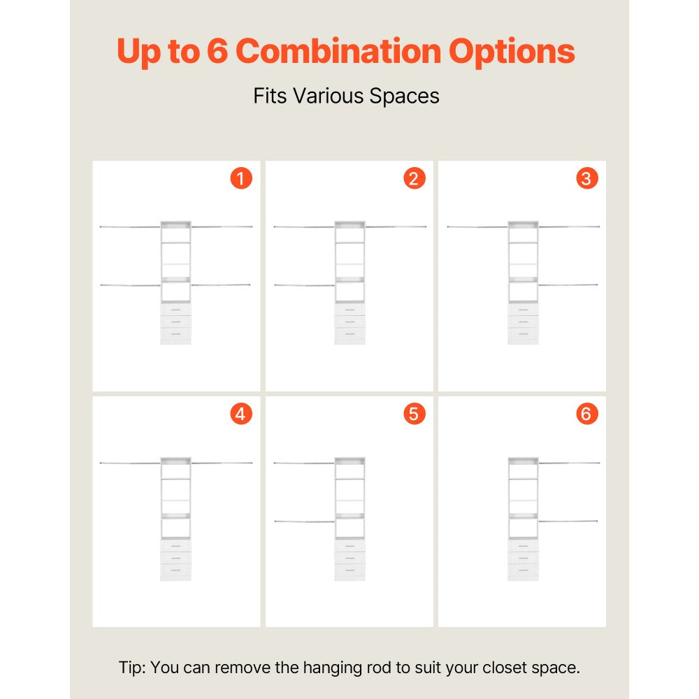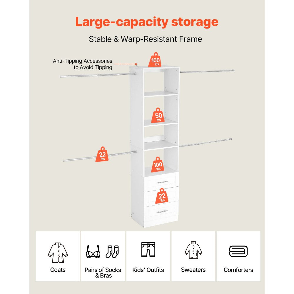 - Large Capacity: Supporting up to 800 lbs / 362.7 kg, this closet system with drawers can hold around 100 garments. Use its compartments to separate items neatly, keeping everything visible and easy to access