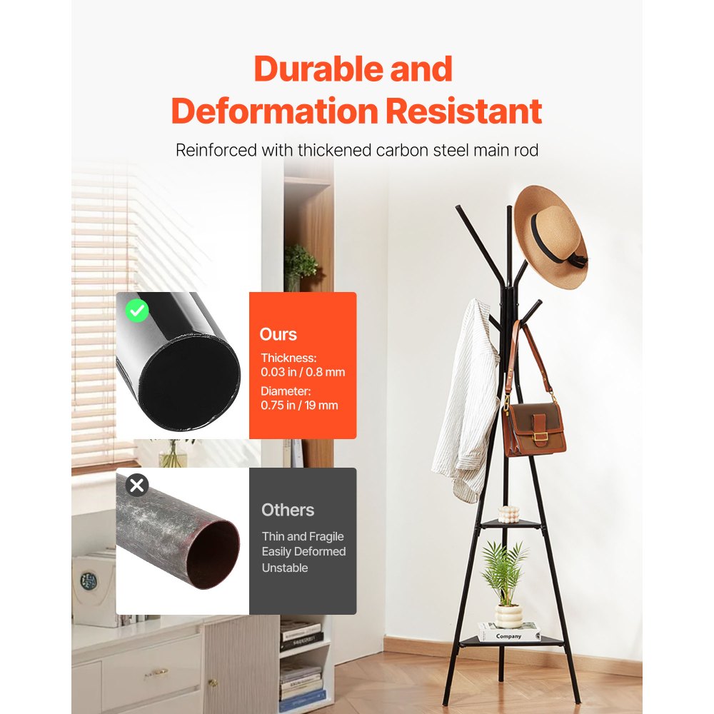 - Stable and Anti-Tipping: This coat rack stand features a stable triangular structure, providing a solid foundation that prevents tipping. Combined with its thickened carbon steel main rod, it ensures reliable stability when loaded with coats, hats, ties and bags