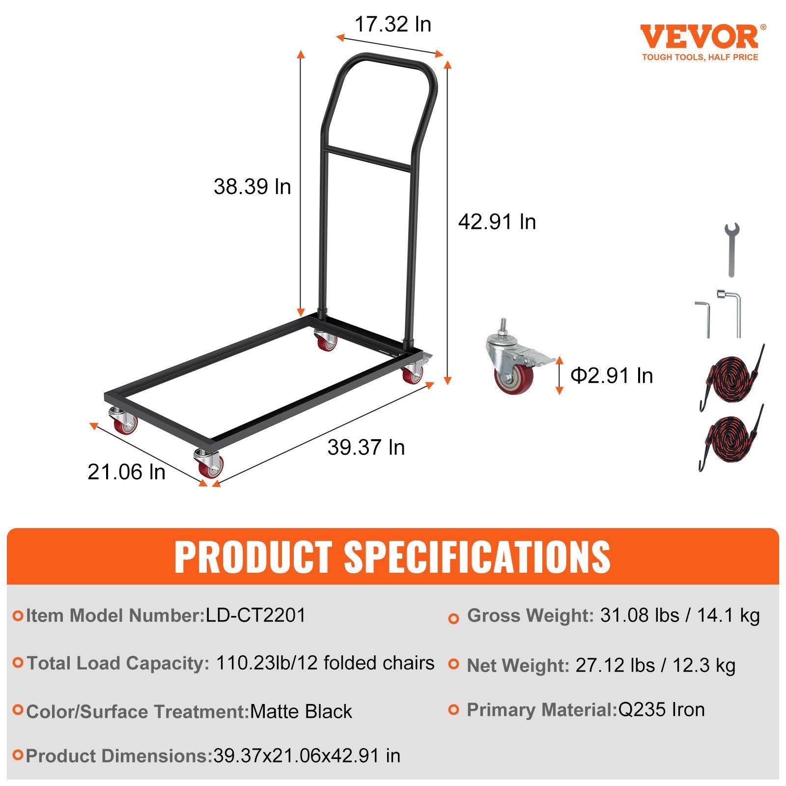 Primary Material: Q235 Iron,Item Model Number: LD-CT2201,Color/Surface Treatment: Matte Black,Total Load Capacity: 110.23 lbs / 12 Folded Chairs,Product Dimensions: 39.37x21.06x42.91 inches / 1000x535x1090 mm,Net Weight: 25.35 lbs / 11.5 kg