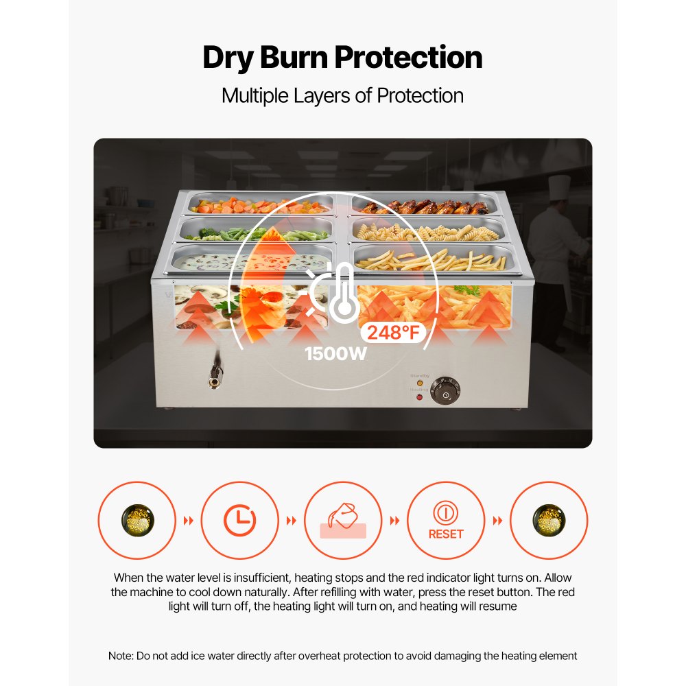 - Smart Stop Feature: When the temperature passes 248°F (120°C), the food warmer stops heating on its own. To use again, refill with water and press the reset button. Avoid pouring in ice water, which can damage the heating tube