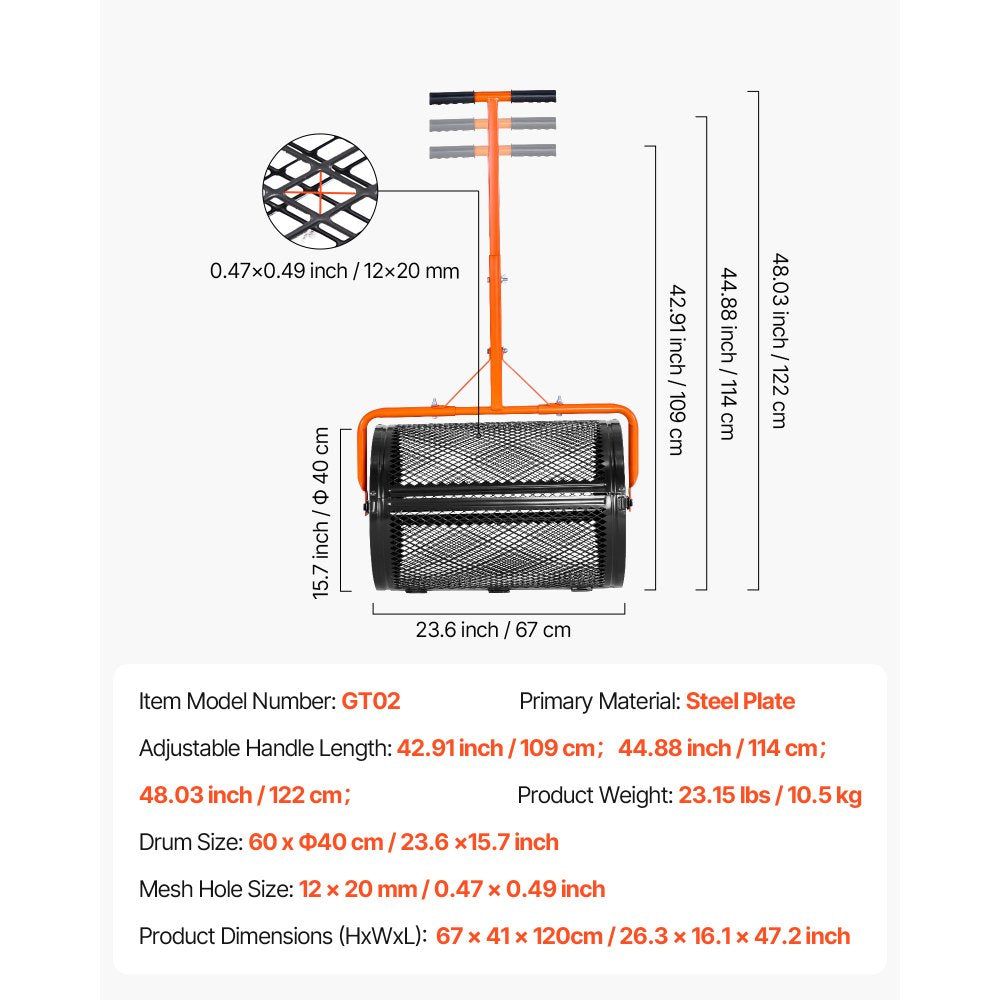 Primary Material: Steel Plate,Adjustable Handle Length: 42.91 inch / 109 cm, 44.88 inch / 114 cm, 48.03 inch / 122 cm,Product Dimensions (HxWxL): 67 x 41 x 120cm/26.3 × 16.1 × 47.2 inch,Item Model Number: GT02,Product Weight: 23.15 lbs / 10.5 kg,Drum Size: 60xФ40 cm/23.6 ×15.7 inch,Mesh Hole Size: 12×20 mm/0.47 ×0.49 inch