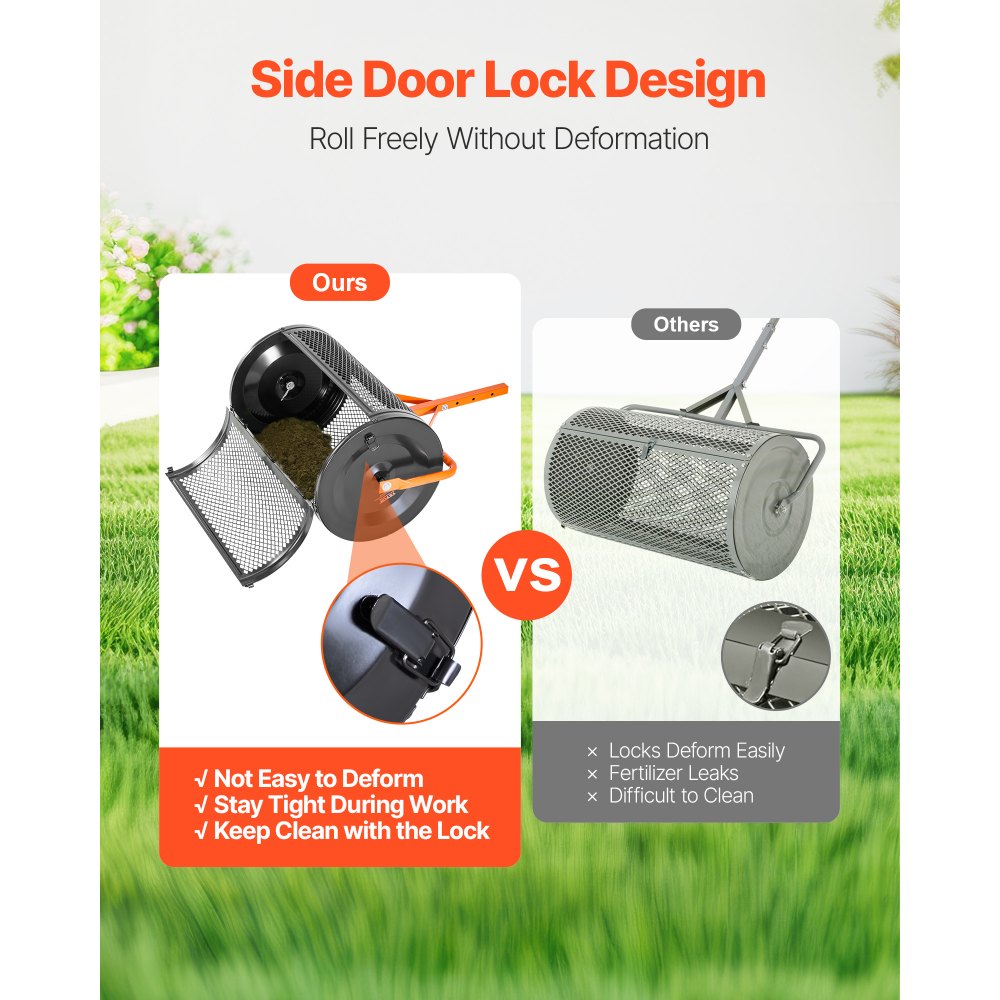 - Large Capacity Drum: The 24-inch peat moss roller holds up to 2.66 cubic feet of material, reducing the need for frequent refills. Load it once with grass seed, compost, or soil conditioner to cover large areas quickly and easily.