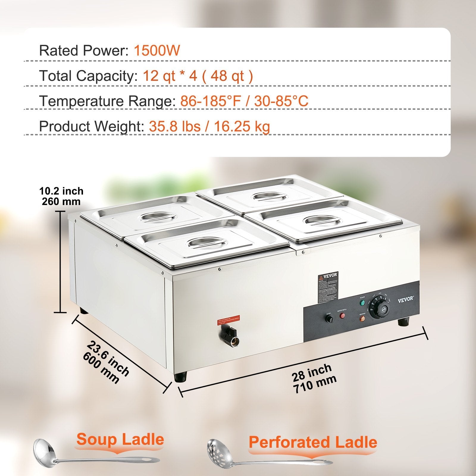 Total Capacity: 12 qt*4 (48 qt),Product Weight: 35.8 lbs / 16.3 kg,Temperature Range: 86-185°F / 30-85°C,Rated Power: 1500W,Product Dimensions: 28.0" x 23.6" x 10.2" / 710 x 600 x 260 mm,Food Pan Size: 10.4" x 12.8" x 5.9" / 265 x 325 x 150 mm