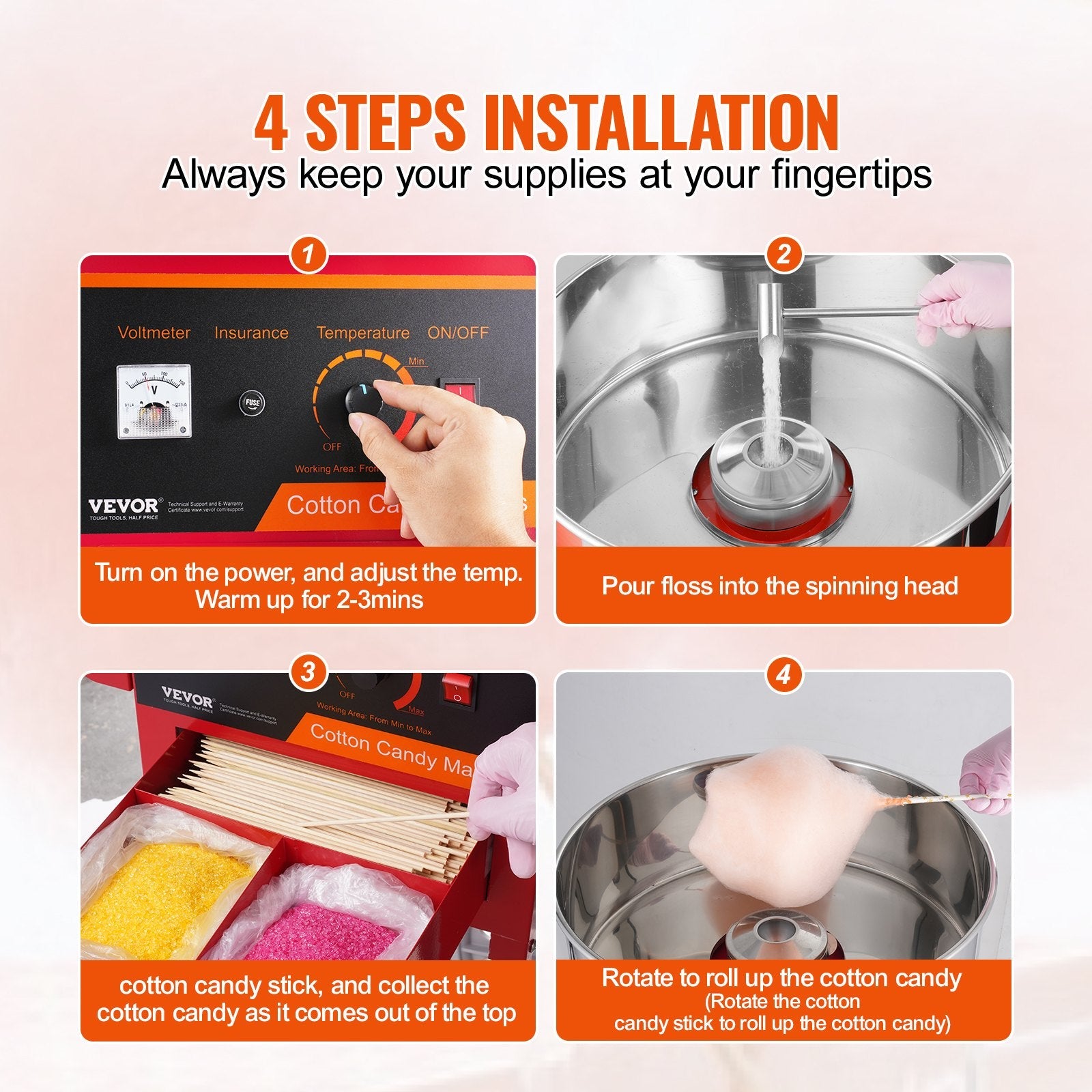 Item Body Weight:33.1 lbs / 15 kg,Candy Bowl Material: SUS201 Food Grade Stainless Steel,Item Size: 20.4x32.3x39.4 inch / 518x820x1000 mm,Candy Bowl Capacity: 3.5 Ounces ±5%,Color: Red,Item Model Number: MHTJJPHC01,Rated Power: 1000W,Cotton Candy Yield: 6 pcs/min,Temp Range: 244.9x439.2°F / 118.3-226.2℃