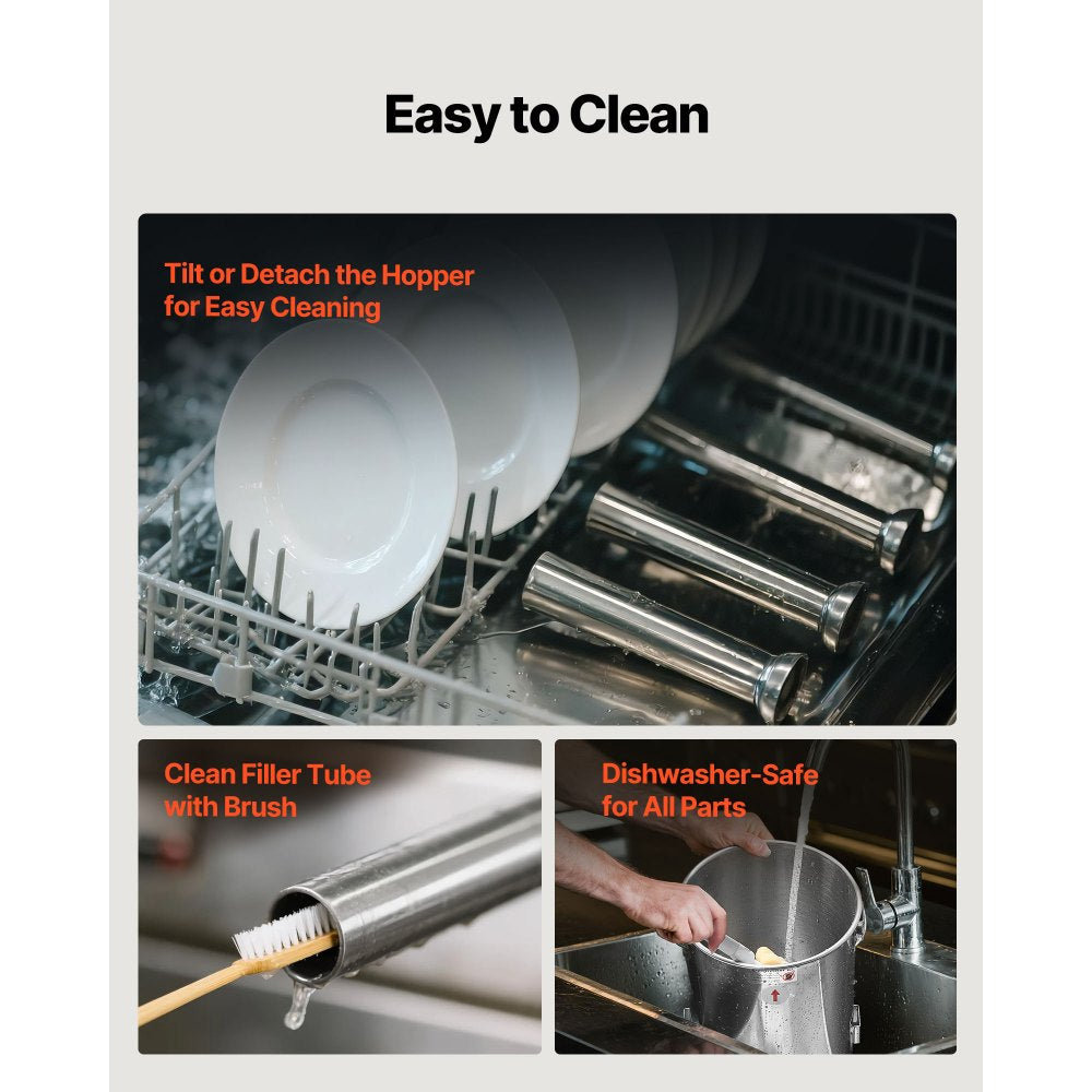 - Easy to Clean: Our sausage filling machine features detachable parts like the barrel, piston, and tubes, all dishwasher-safe. The stainless steel surface wipes clean easily. Suitable for home, business, hunting, or fresh pet food prep