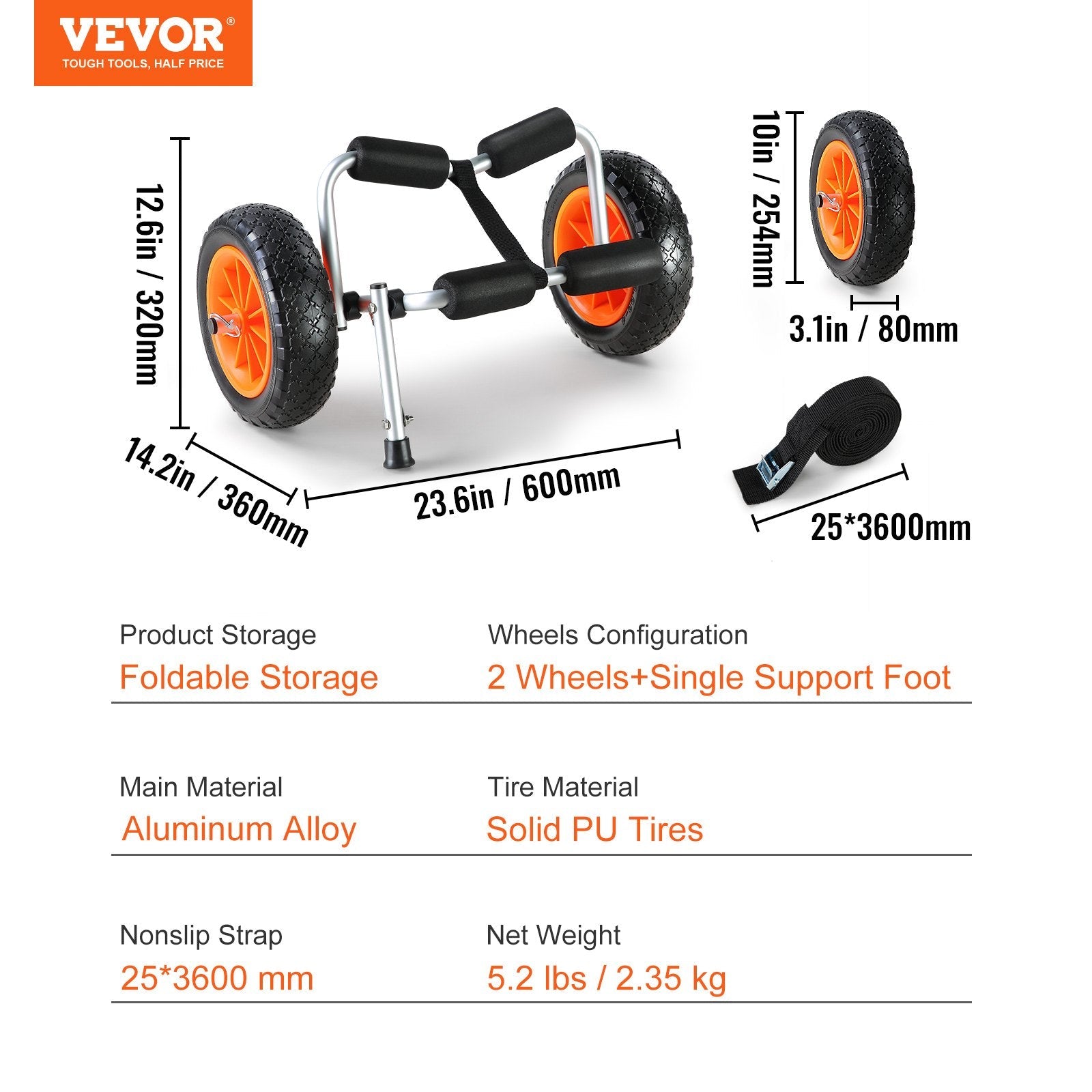 Nonslip Strap: 25*3600 mm,Tire Material: Solid PU Tires,Product Storage: Foldable Storage,Product Dimensions: 23.6 x 14.2 x 12.6 inch / 600×360×320 mm,Net Weight: 5.2 lbs / 2.35 kg,Wheels Configuration: 2 Wheels+Single Support Foot,Main Material: Aluminum Alloy
