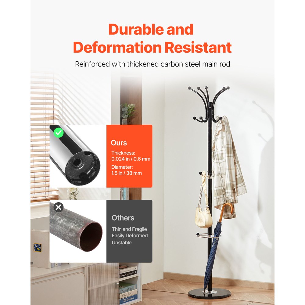 Tube Wall Thickness: 0.024 in / 0.6 mm,Base Thickness: 0.6-0.8 in / 15-20 mm,Total Load Capacity: 33 lbs / 15 kg,Product Dimensions: 14.57 x 14.57 x 69.29 inch / 370 x 370 x 1760 mm,Single Hook Weight Capacity: 6.6 lbs / 3 kg,Type: Freestanding Coat Rack with Umbrella Holder,Base Diameter: 14.6 in / 370 mm ,Item Model Number:GH-8617,Circular Tube Diameter: 1.5 in / 38 mm,Number of Hooks: 14,Net Weight: 18.07 lbs / 8.2 kg,Main Material: Carbon Steel,Base Material: Black Marble