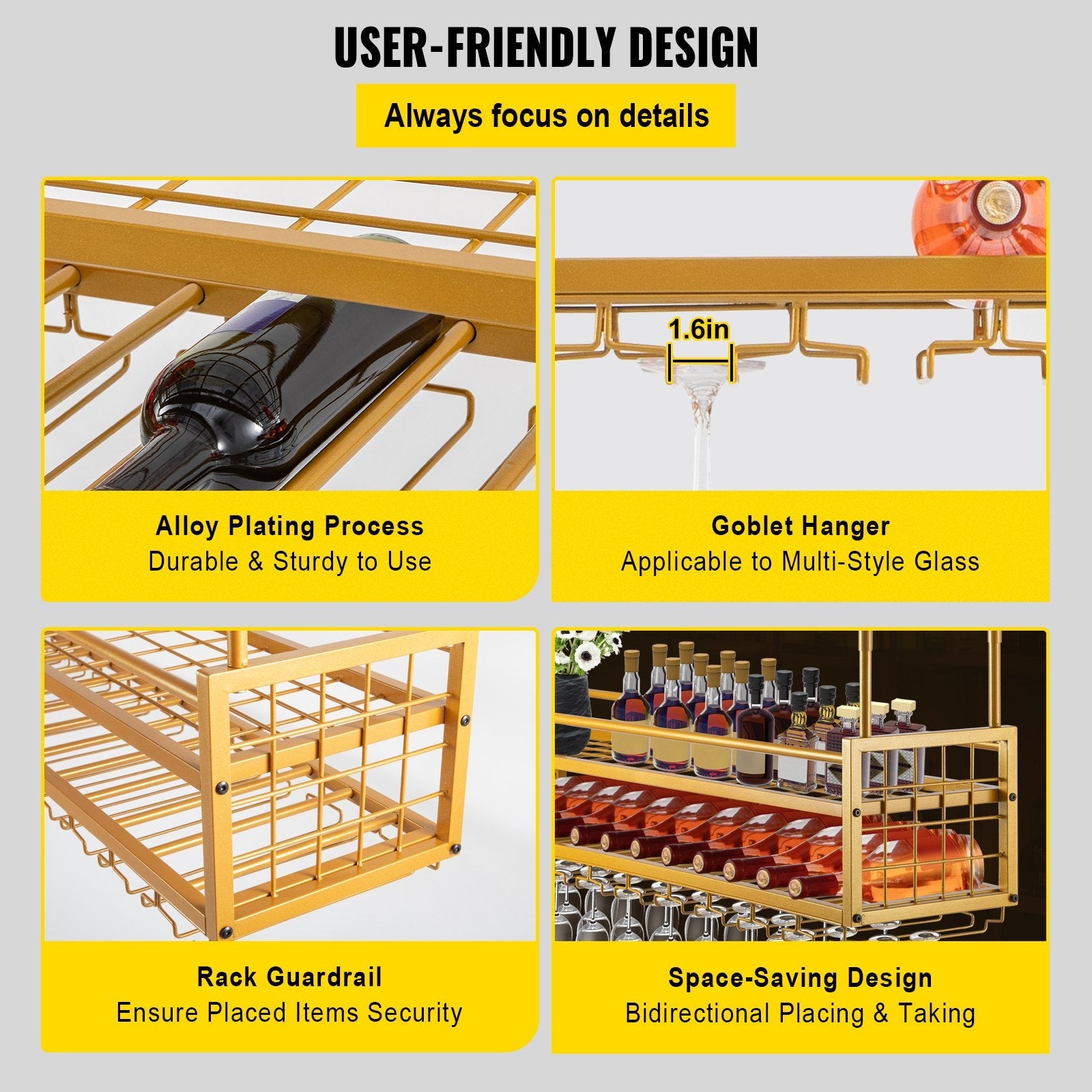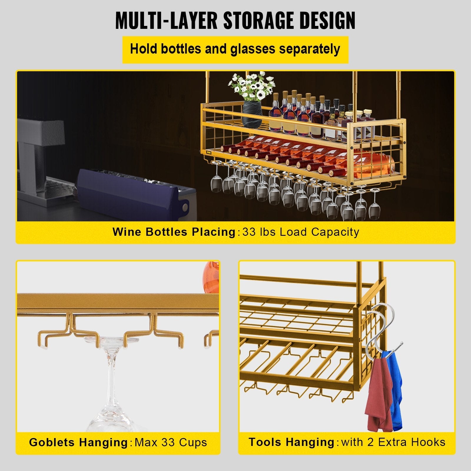 Ceiling-Mounted Bar Wine Rack Wine Glass Hanging Rack 46.9x11.8in Gold