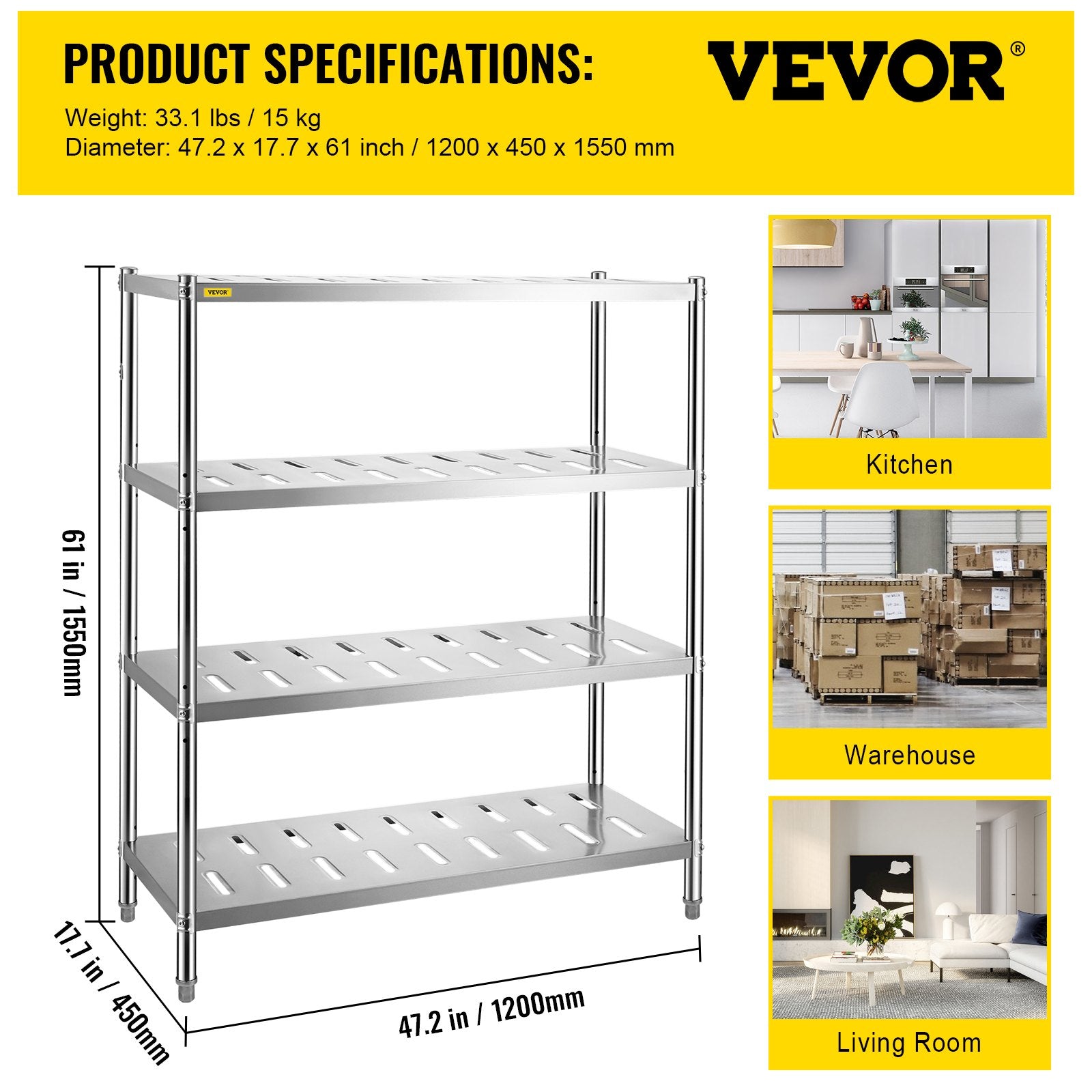 Column Width: 3.8 cm / 1.5 inch,Load Capacity: 132 Lbs Per Shelf,Tier Thickness: 4 cm / 1.6 inch,Model: VV-SSPS-4-48,Product Weight: 15 kg / 33.1 lbs,Material: Stainless Steel,Product Dimensions: 120 x 45 x 155 cm / 47.2 x 17.7 x 61 inch,Shelf Type: 4 Tier,Adjustable Feet Height Range: 5.1 cm / 2 inch Upward & Downward