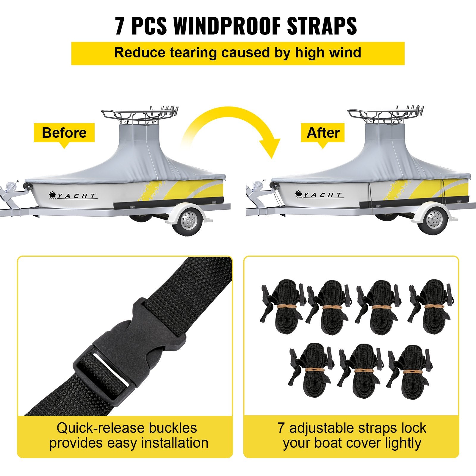 Length of Pole: 53.9" / 137cm,Size: 24 x 9.84 ft/ 7.32x 3 m,Number of Straps: 7,Model: 22-24 ft T-Top Boat Cover,Fit for Boat: 22-24 ft/ 6.71 m-7.32 m,Material: 600D Oxford Fabric,Number of Poles: 2,Beam Width: Up to 118" / 300 cm