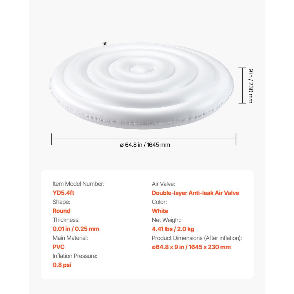 Thickness: 0.01 in / 0.25 mm,Inflated Dimensions: ∅65 x 9 in / 1645 x 230 mm,Inflation Pressure: 0.8 psi,Shape: Round,Color: White,Item Model Number: YD5.4ft,Air Valve: Double-layer Anti-leak Air Valve,Product Dimensions: ∅65 x 9 in / 1645 x 230 mm,Net Weight: 4.41 lbs / 2.0 kg,Main Material: PVC