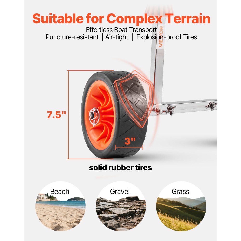 - Smooth Ride: Equipped with 7.5-inch solid rubber wheels and 3-inch wide tires, this kayak roller cart easily glides over sand, gravel, and grass. No air needed – enjoy a hassle-free, maintenance-free experience on any terrain