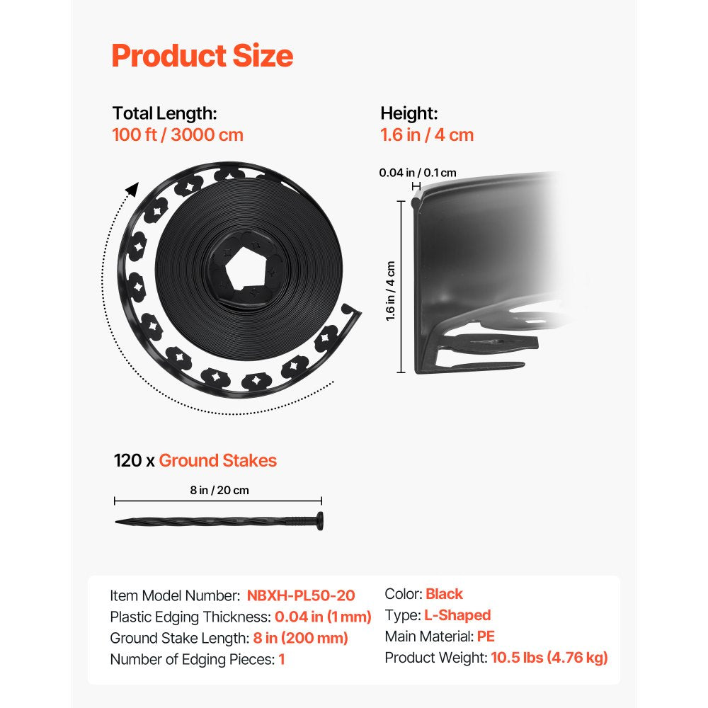 Plastic Edging Dimensions: 100 ft x 1.6 in (3000 x 4 cm),Type: L-Shaped,Number of Edging Pieces: 1,Color: Black,Item Model Number: NBXH-PL50-20,Product Weight: 10.5 lbs (4.76 kg),Ground Stake Length: 8 in (200 mm),Plastic Edging Thickness: 0.04 in (1 mm),Main Material: PE