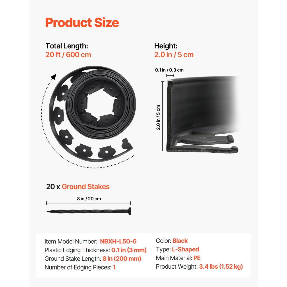 Plastic Edging Dimensions: 20 ft × 2.0 in (600 × 5 cm),Type: L-Shaped,Number of Edging Pieces: 1,Color: Black,Item Model Number: NBXH-L50-6,Product Weight: 3.4 lbs (1.52 kg),Ground Stake Length: 8 in (200 mm),Plastic Edging Thickness: 0.1 in (3 mm),Main Material: PE