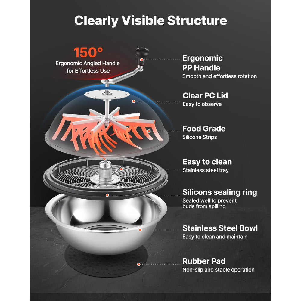 Bowl Material: 201 Stainless Steel,Blade Fingers: 5 x 4 + 4 x 4,Lid Material: PET,Item Model Number: V-BT-PS-24,Item Dimensions: 23.6 × 23.6 × 21.1 in / 600 × 600 × 535 mm,Weight: 18.1 lbs / 8.2 kg,Handle: 145° Aluminum Handle