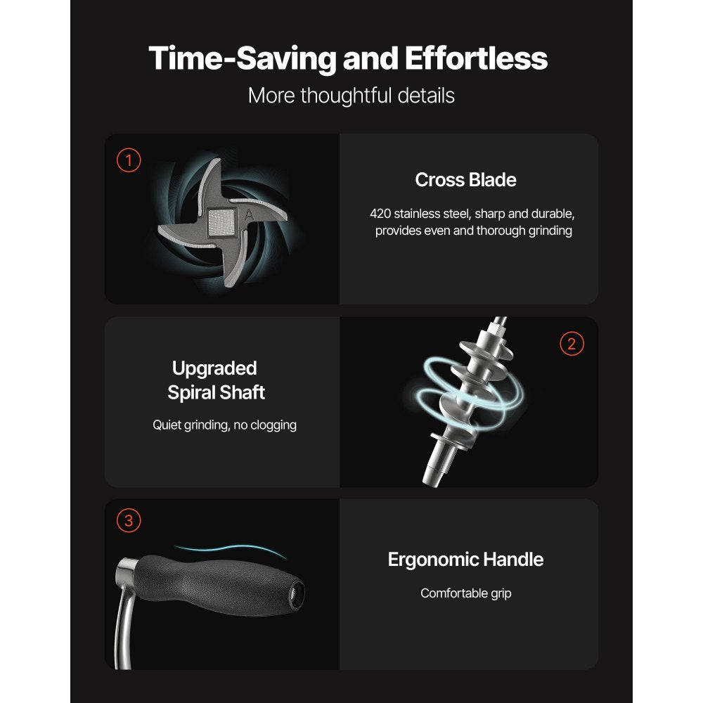 - Easy to Clean: The detachable design allows all meat grinder parts to be cleaned in the dishwasher, making cleanup a breeze. After use, simply wipe dry and store for a tidy kitchen. Tip: Regularly apply edible oil to the blade to keep it sharp