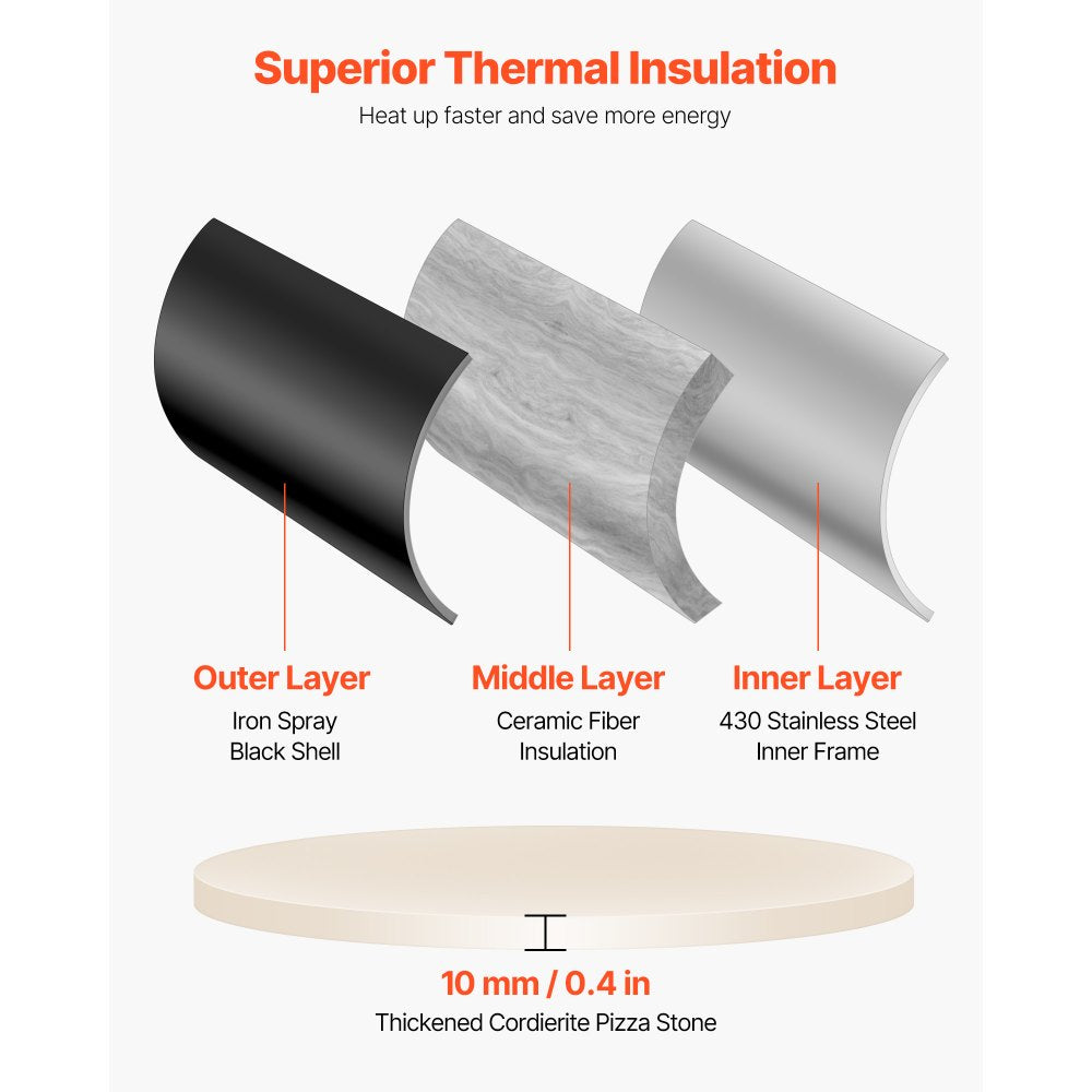 - Durable Construction: pizza oven withstands outdoor conditions and frequent use. Adopted a 3-layer design, promoting efficient heat circulation. Featuring a iron spray black shell, and thick insulation cotton, it ensures durability and excellent heat retention