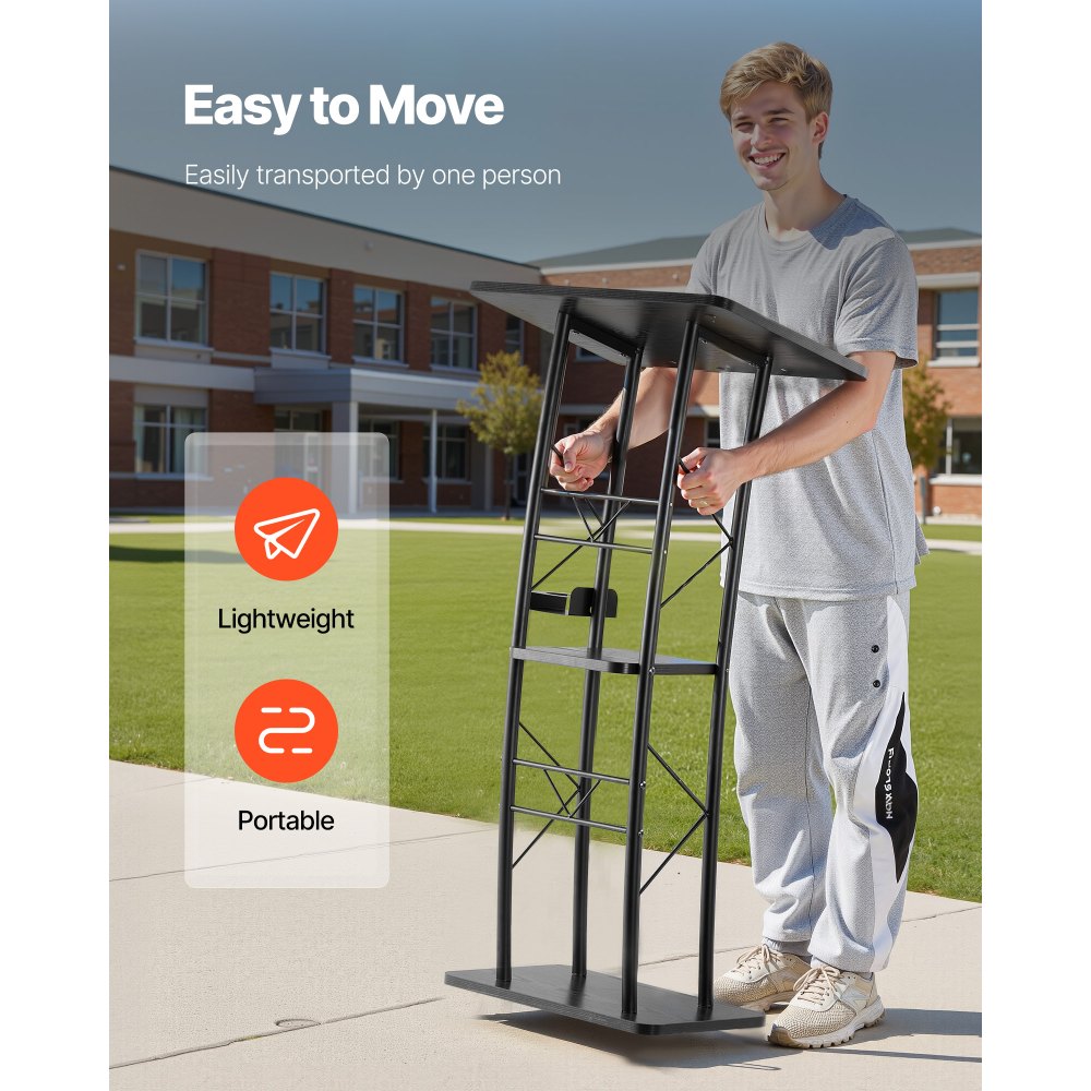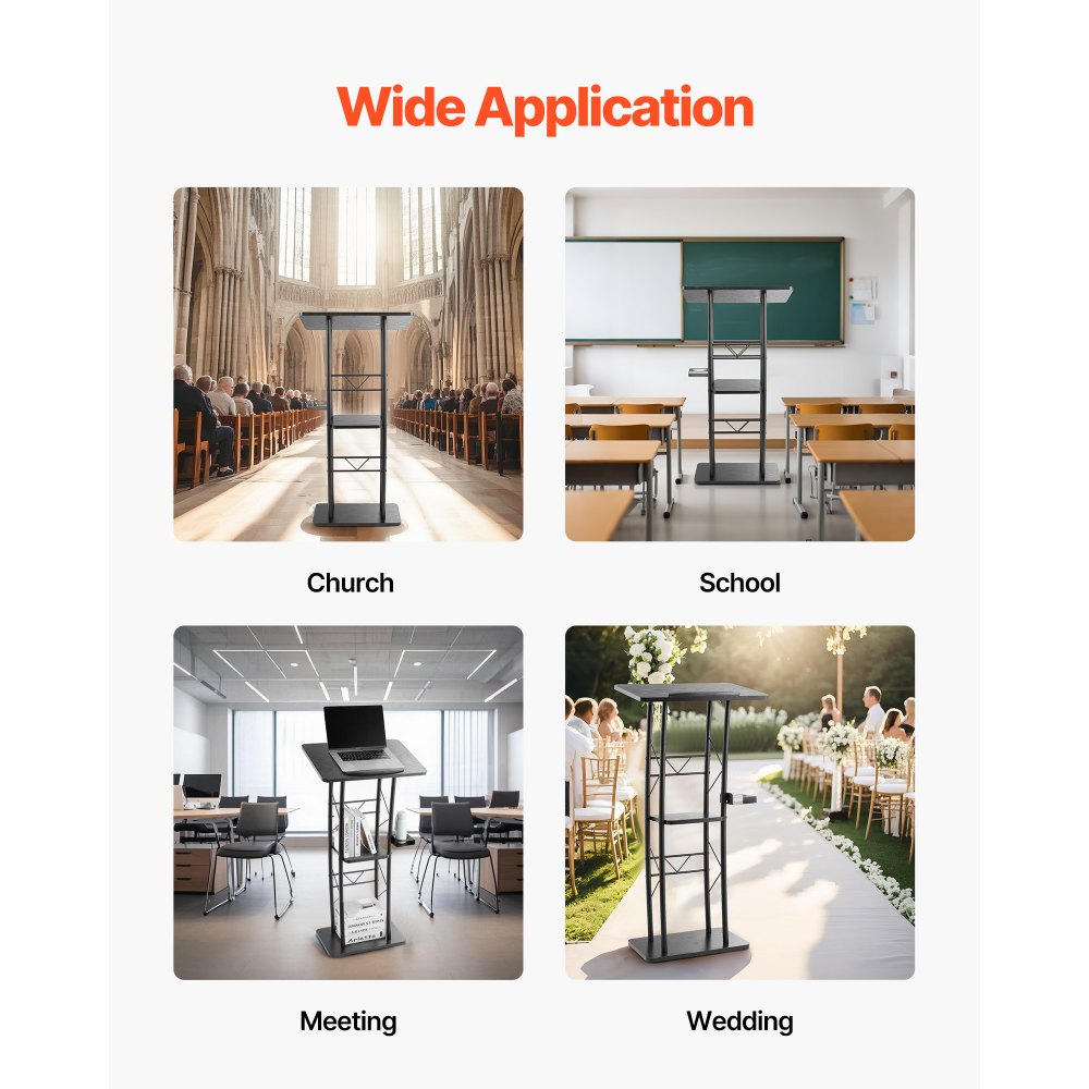 - Open Storage, Quick Access: This metal podium includes an open shelf and side accessory rack for storing mics, notebooks, remotes, or tablets. Keep presentation tools organized and within easy reach, no more scrambling during speeches