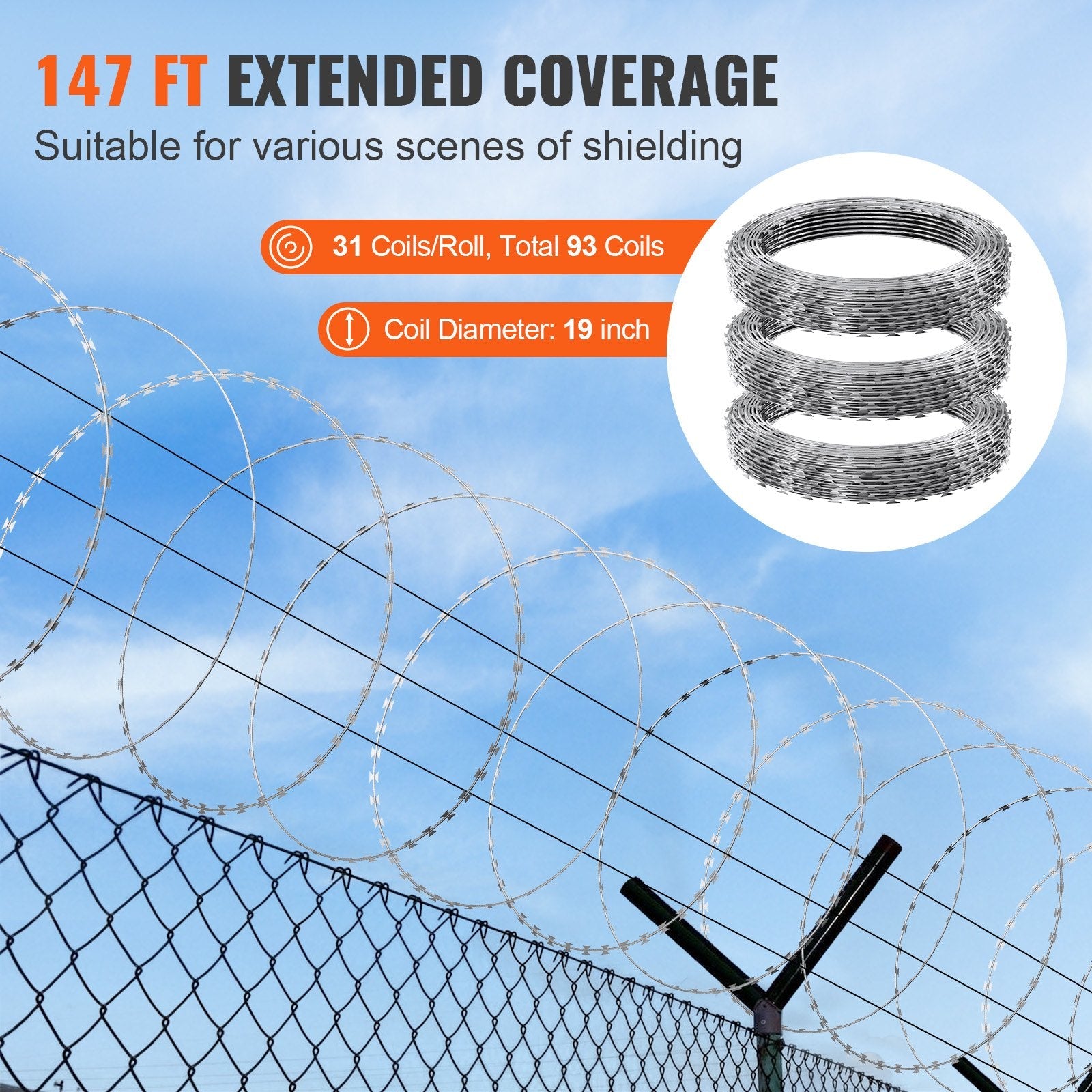 Razor Wires, 147 ft Razor Barbed Wire, 3 Rolls Razor Wire Fencing Razor Fence, Razor Ribbon Barbed Wire Galvanized Razor Wire Fence, Rolls Razor for Garden