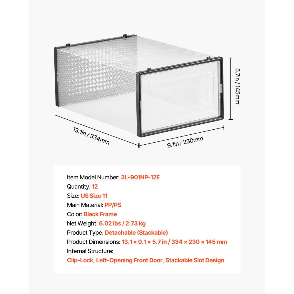 Product Type: Detachable (Stackable),Size: US Size 11,Color: Black Frame,Item Model Number: 3L-901NP-12E,Quantity: 12,Product Dimensions: 13.1 x 9.1 x 5.7 in / 334 x 230 x 145 mm,Net Weight: 6.02 lbs / 2.73 kg,Main Material: PP/PS