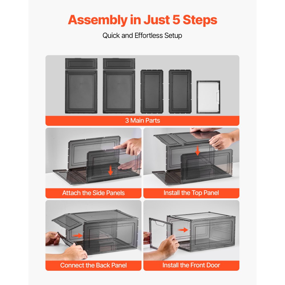 - Quick, Tool-Free Assembly: No complicated setup – just 5 easy steps to assemble. The plastic shoe organizer fits up to US Size 13 shoes. The transparent body and front door make it simple to spot your shoes, keeping your space neat and organized