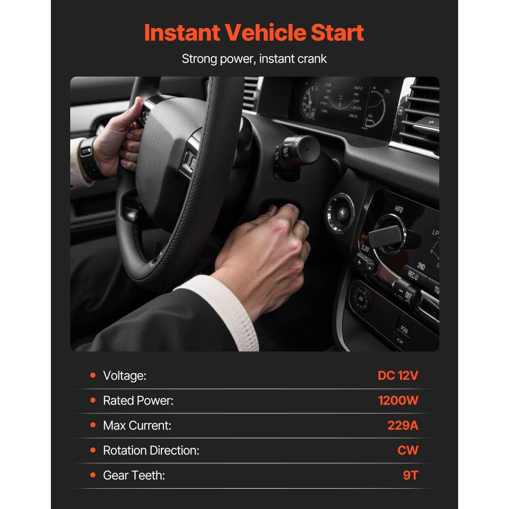 - OEM Starter Specifications: Protection Rating: IP54; Voltage: DC 12V; Rated Power: 1200W; Max Current: 229A; Rotation Direction: CW (clockwise); Gear Teeth Count: 9T