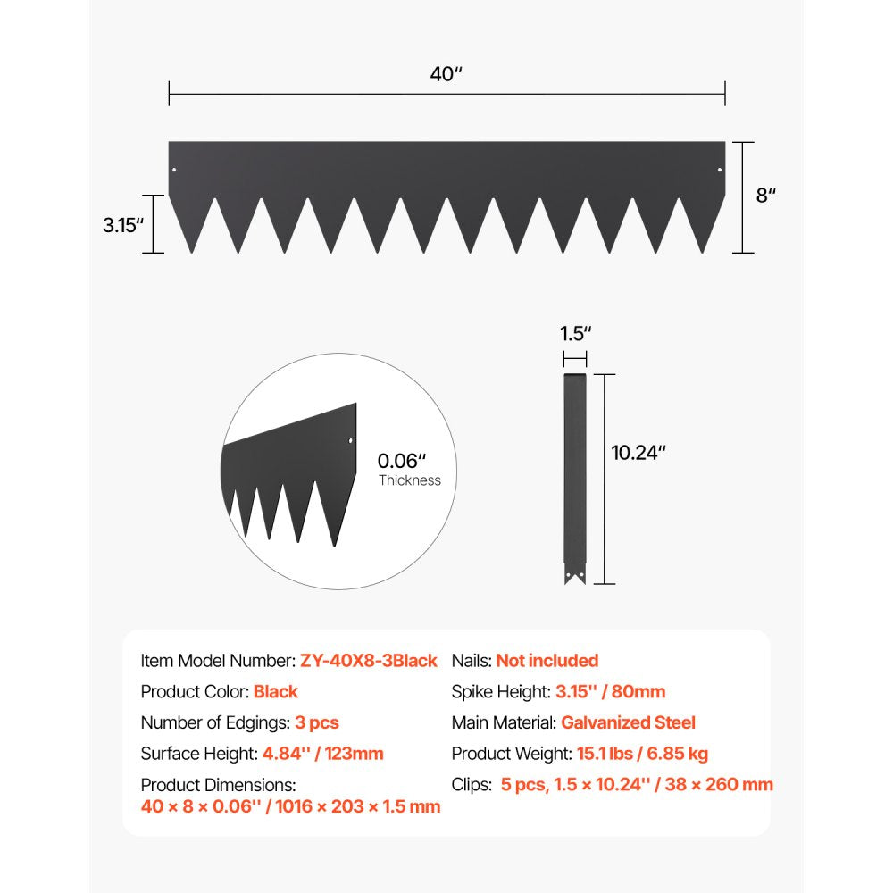 Surface Height: 4.84 in/ 123mm,Clips: 5 pcs, 1.5 x 10.24 in/ 38 x 260 mm,Number of Edgings: 3 pcs,Nails: Not included,Product Color: Black,Item Model Number: ZY-40X8-3Black,Product Weight: 15.1 lbs / 6.85 kg,Product Dimensions: 40 x 8 x 0.06 in/ 1016 x 203 x 1.5 mm,Spike Height: 3.15 in/ 80mm,Main Material: Galvanized Steel