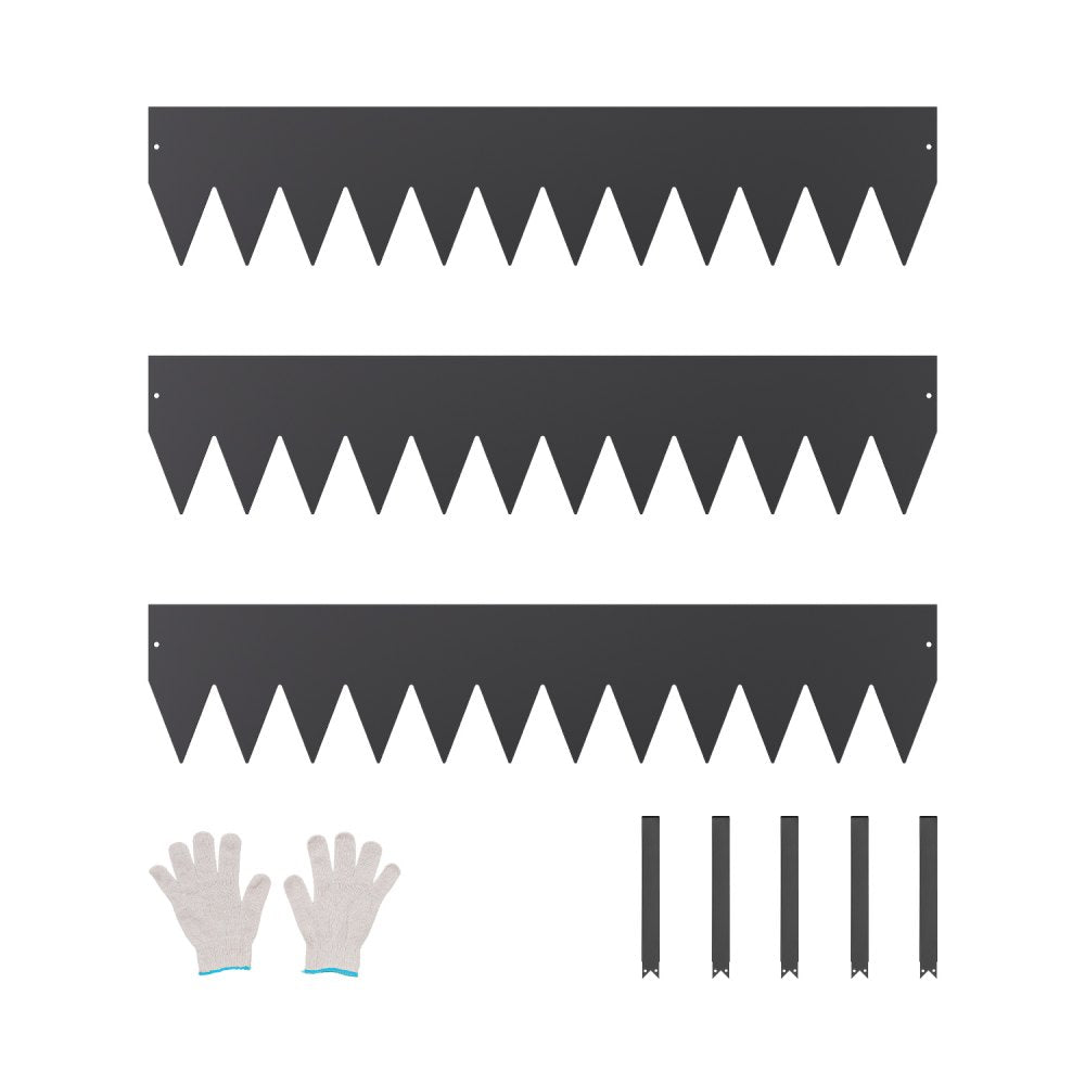 - What You’ll Receive: Each set includes 3 metal flowerbed edging borders, 1 pair of installation glove, 5 clips and 1 instruction manual. The extended spiked design ensures easy installation by helping the barrier penetrate the ground with less effort. Spend more time enjoying your garden and less time maintaining it!