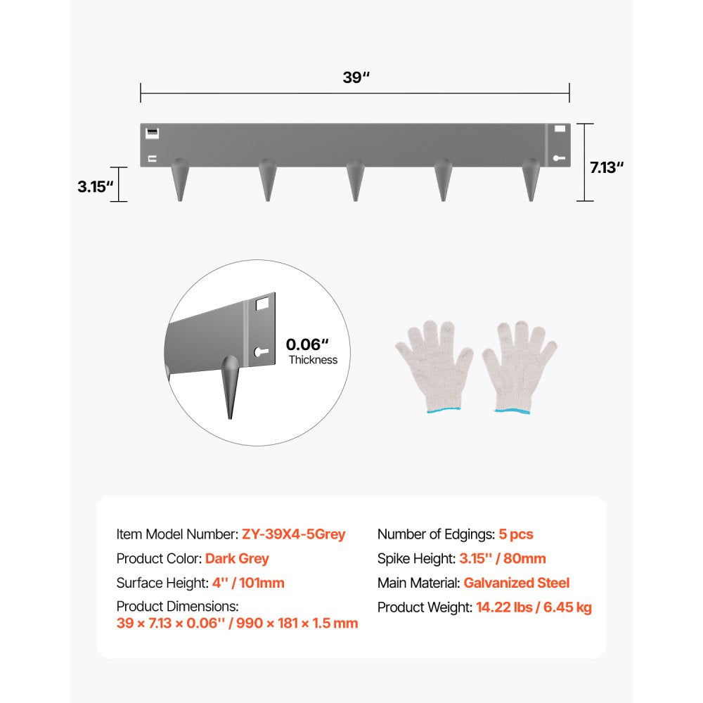 Surface Height: 4 in/ 101mm,Number of Edgings: 5 pcs,Product Color: Dark Grey,Item Model Number: ZY-39X4-5Grey,Product Weight: 14.22 lbs / 6.45 kg,Product Dimensions: 39 x 7.13 x 0.06 in/ 990 x 181 x 1.5 mm,Spike Height: 3.15 in/ 80mm,Main Material: Galvanized Steel
