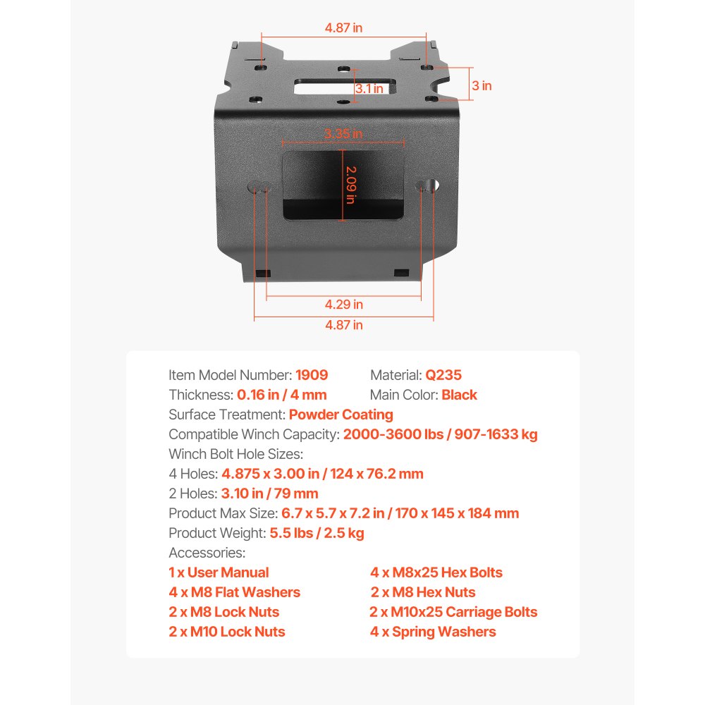 Thickness: 0.16 in / 4 mm,Main Color: Black,Winch Bolt Hole Sizes:,Item Model Number: 1909,Surface Treatment: Powder Coating,2 Holes: 3.10 in / 79 mm,Product Weight: 5.16 lbs / 2.34 kg,Material: Q235,Compatible Winch Capacity: 2000-3600 lbs / 907-1633 kg,4 Holes: 4.875 x 3.00 in / 124 x 76.2 mm,Product Max Size: 6.69 x 5.71 x 7.24 in / 170 x 145 x 184 mm