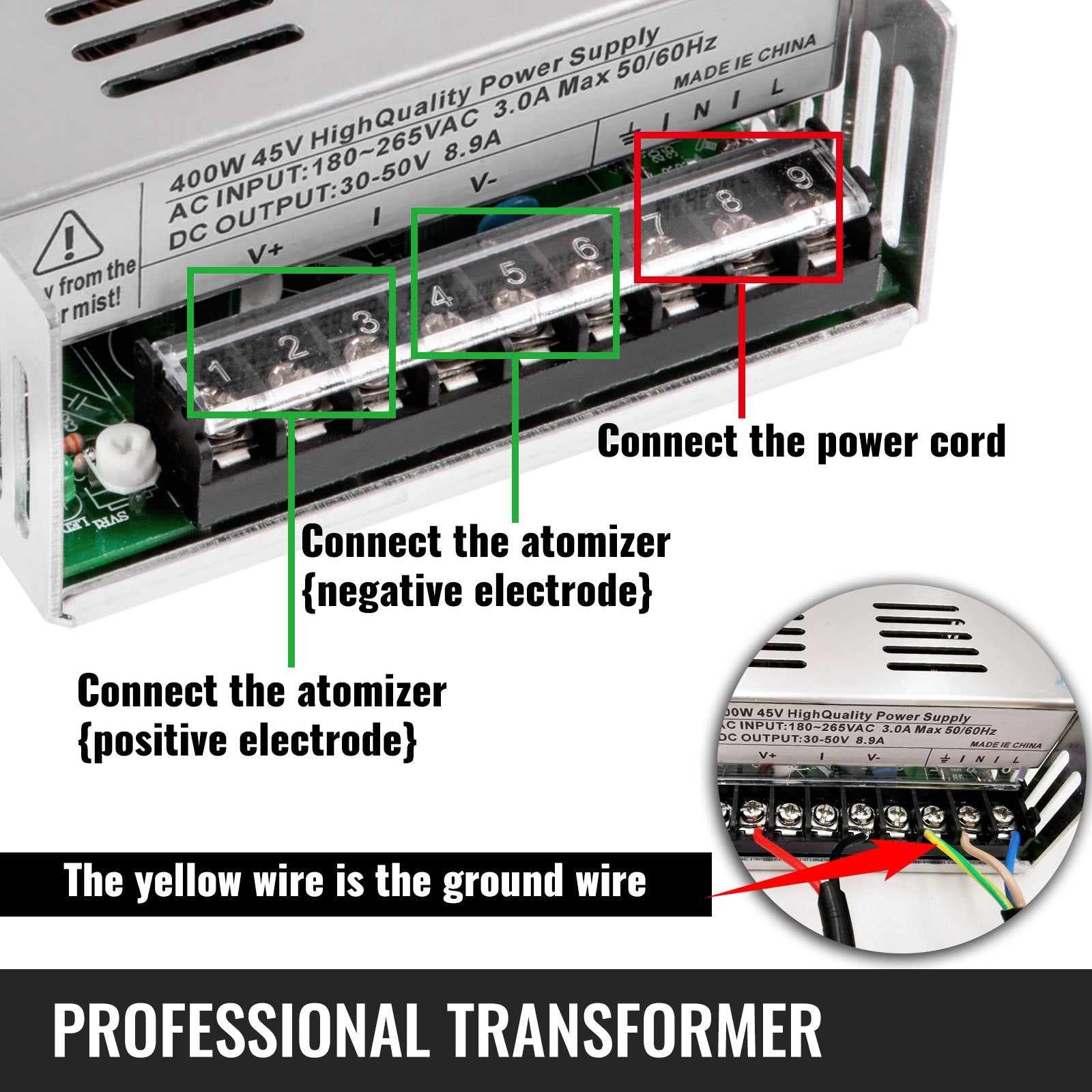 Working current: 4.8A-5A,Transformer Voltage: 220V/DC 48V,Power line: 4.9 ft/1.5 m,Output power: 400 W,Water tempreture: 5-50°C (the normal tempreture is 30°C),Spray volume: 3500- 5000ML / H,Shell material: Copper shell,Cooling model: Air-cooled,Atomizer power: 250 W,Atomizer Line: 9.8 ft/3 m