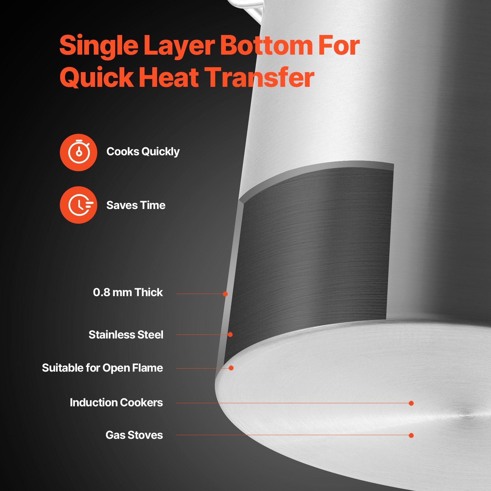 - Quick Heat Transfer Single-Layer Bottom: The heavy duty stock pot's bottom thickness is 0.8 mm and can be used on open flames, induction cookers, and gas stoves. The pot enhances cooking efficiency through quick heat transfer, saving you precious time.