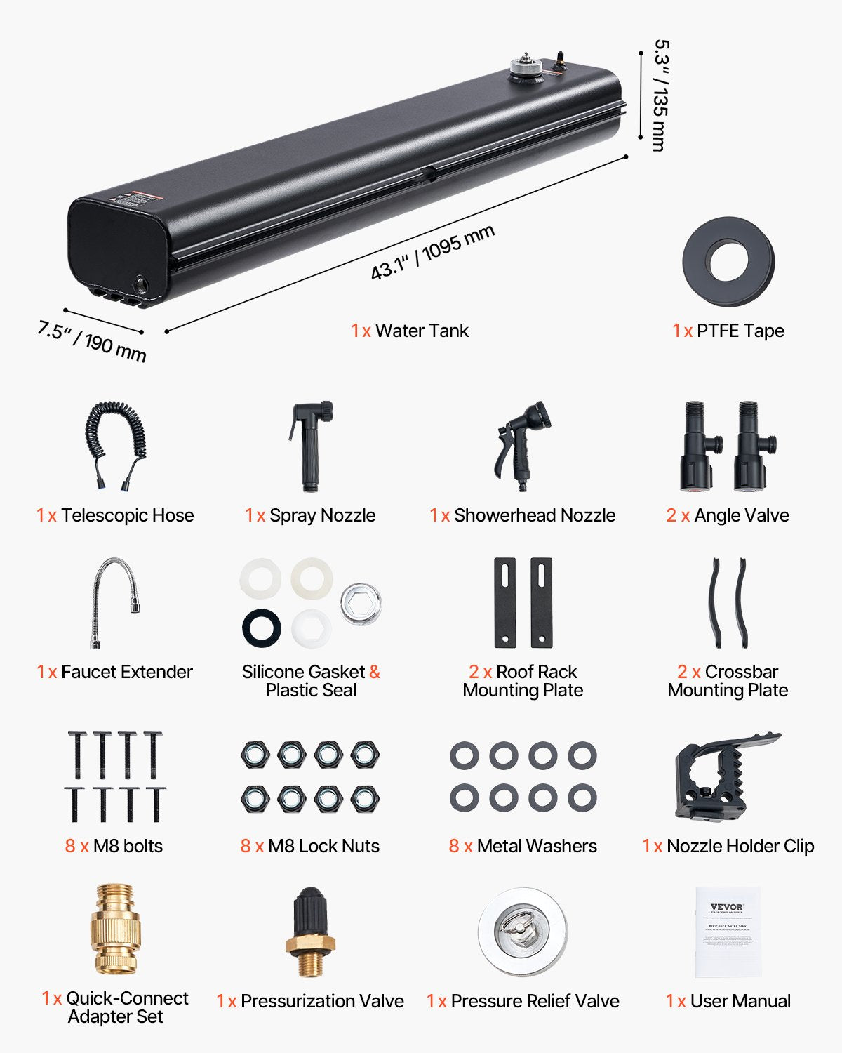 - Versatile Nozzle Options: Equipped with showerhead and spray nozzles, this roof rack water tank is attachable to a 4m telescopic hose for wide-range, long-distance cleaning. It includes a faucet extender with adjustable angles for a refreshing post-activity outdoor shower.