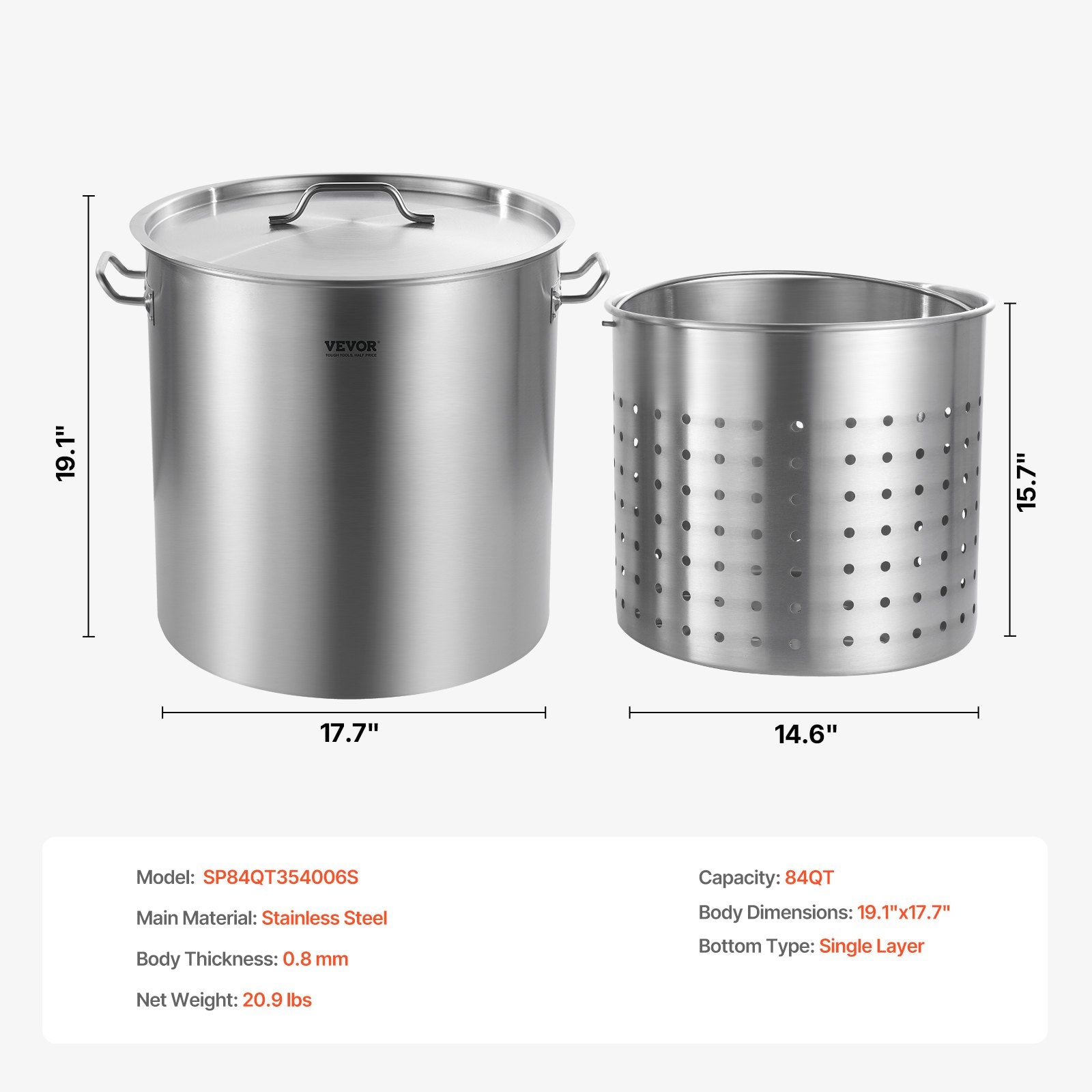 Capacity: 84 QT / 79.5 L,Item Model Number: SP84QT454906S,Bottom Type: Single Layer,Inner Body Dimension: 17.7" x 19.1" / 450 x 485 mm,Body Thickness: 0.8 mm,Net Weight: 20.9 lbs / 9.5 kg,Main Material: Stainless Steel