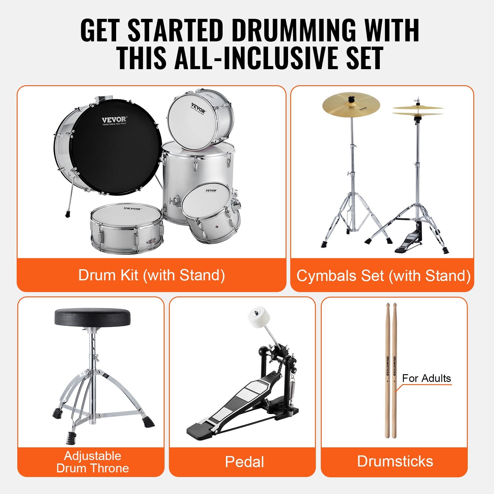 VEVOR Adult Drum Set, 5-Piece, 558.8 mm Complete Full Size Drum Kit with Bass Toms Snare Floor Drum Adjustable Throne Stands Cymbal Hi-Hat Pedal and Drumsticks, Beginner Drum Kit for Adults, Silver