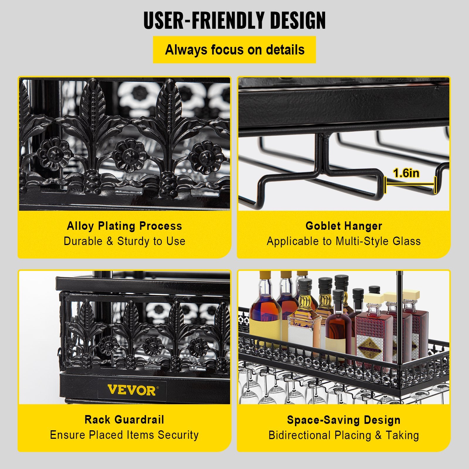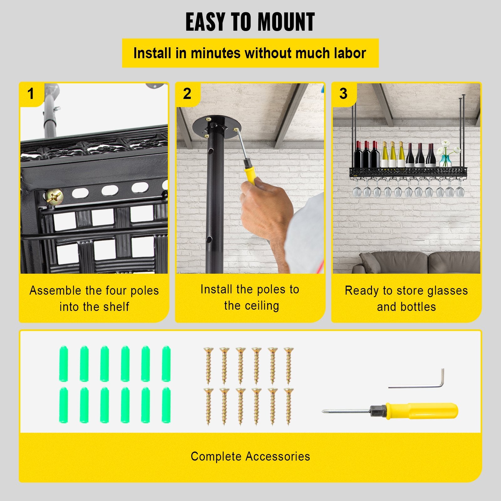 VEVOR Ceiling-Mounted Bar Wine Rack Wine Glass Hanging Rack 46.9x13in Black