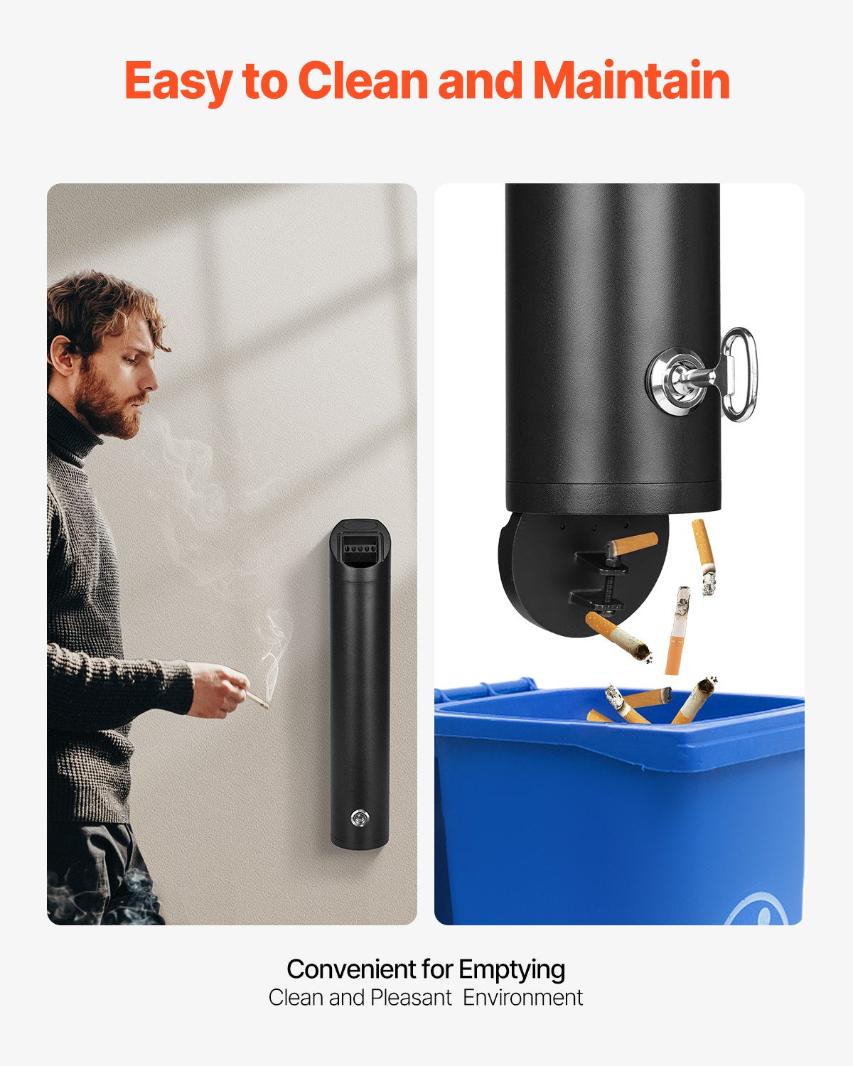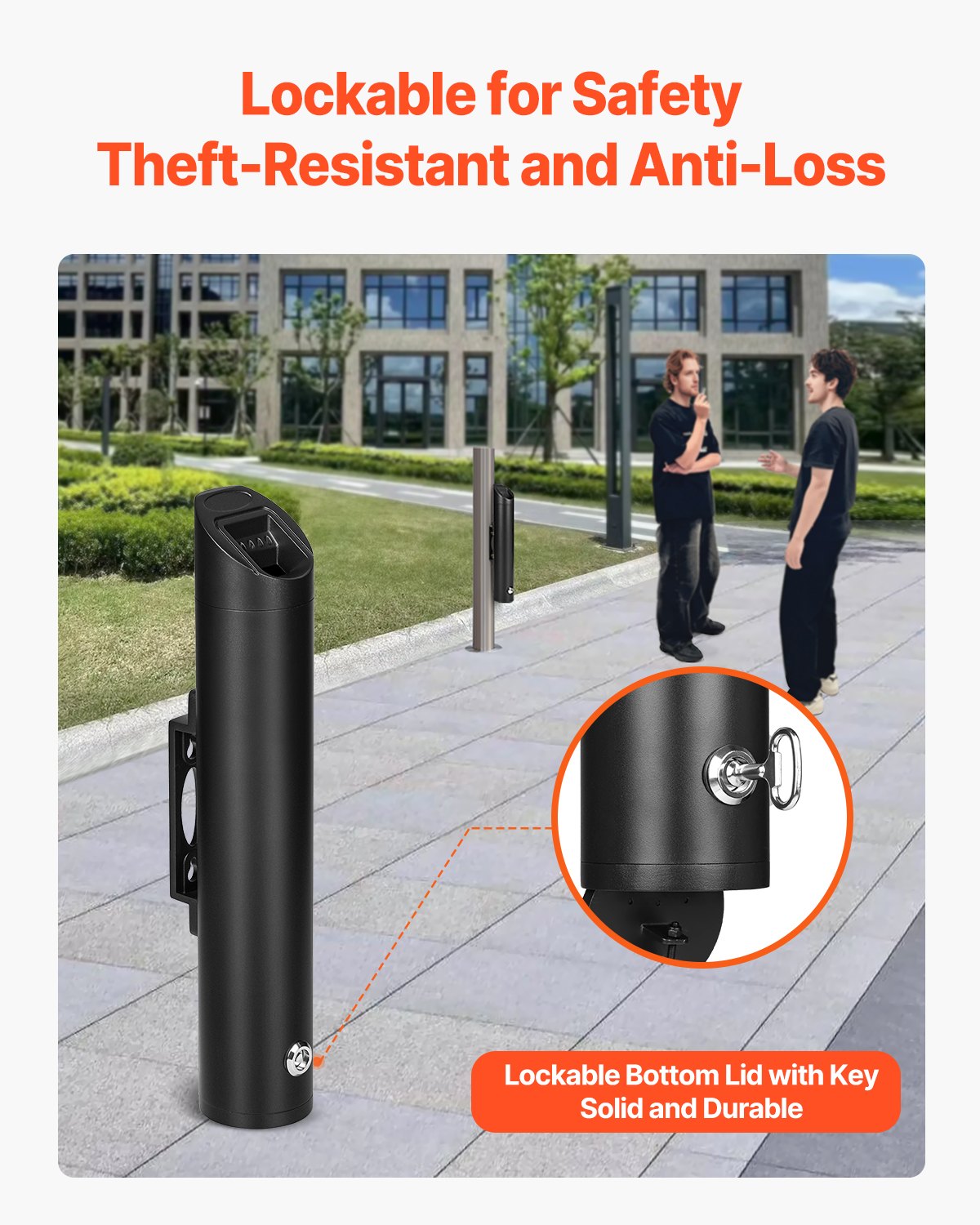 - Easy to Clean: Simply unlock the bottom cover with the key, and you can easily empty the cigarette butts and ashes. The metal surface of the outdoor standing ashtray is also easy to clean—just wipe it down or rinse it for quick maintenance.