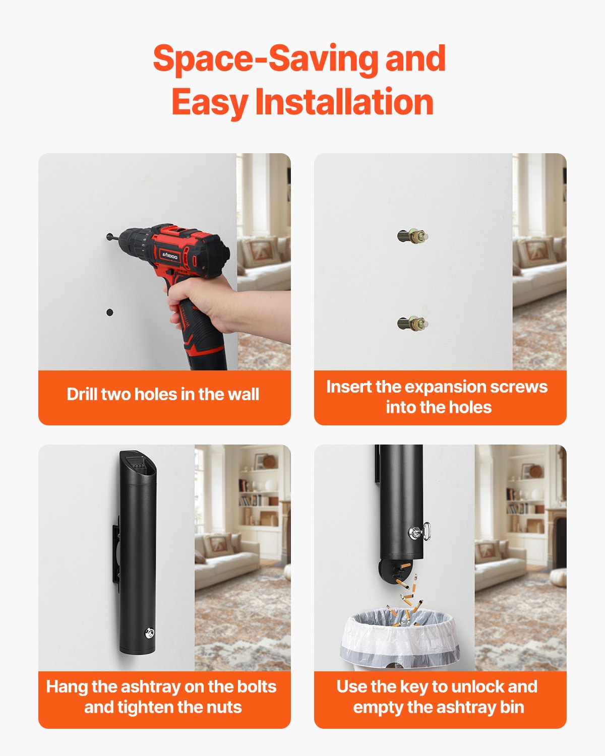 - Compact Wall-Mounted Design: The wall-mounted design saves space, making it ideal for tight spaces. It’s easy to install by simply drilling holes in the wall, offering both a practical and aesthetically pleasing solution for your cigarette disposal container.