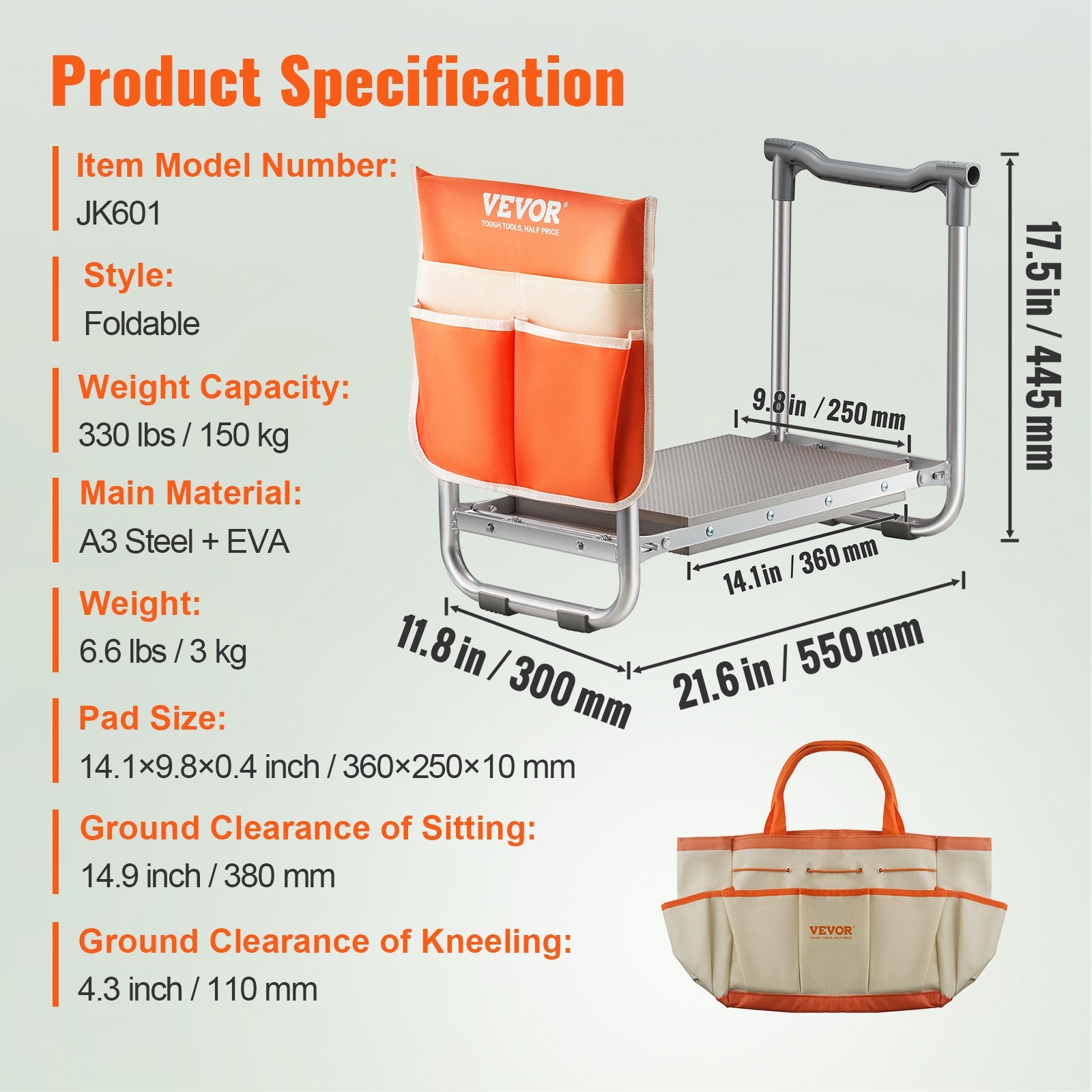 VEVOR Garden Kneeler and Seat, 10" EVA Wide Pad, 330 lbs Load Capacity Foldable Garden Stool, Kneeling Bench for Gardening with Tool Bag, Gifts for Women, Grandparents, Seniors, Mom and Dad