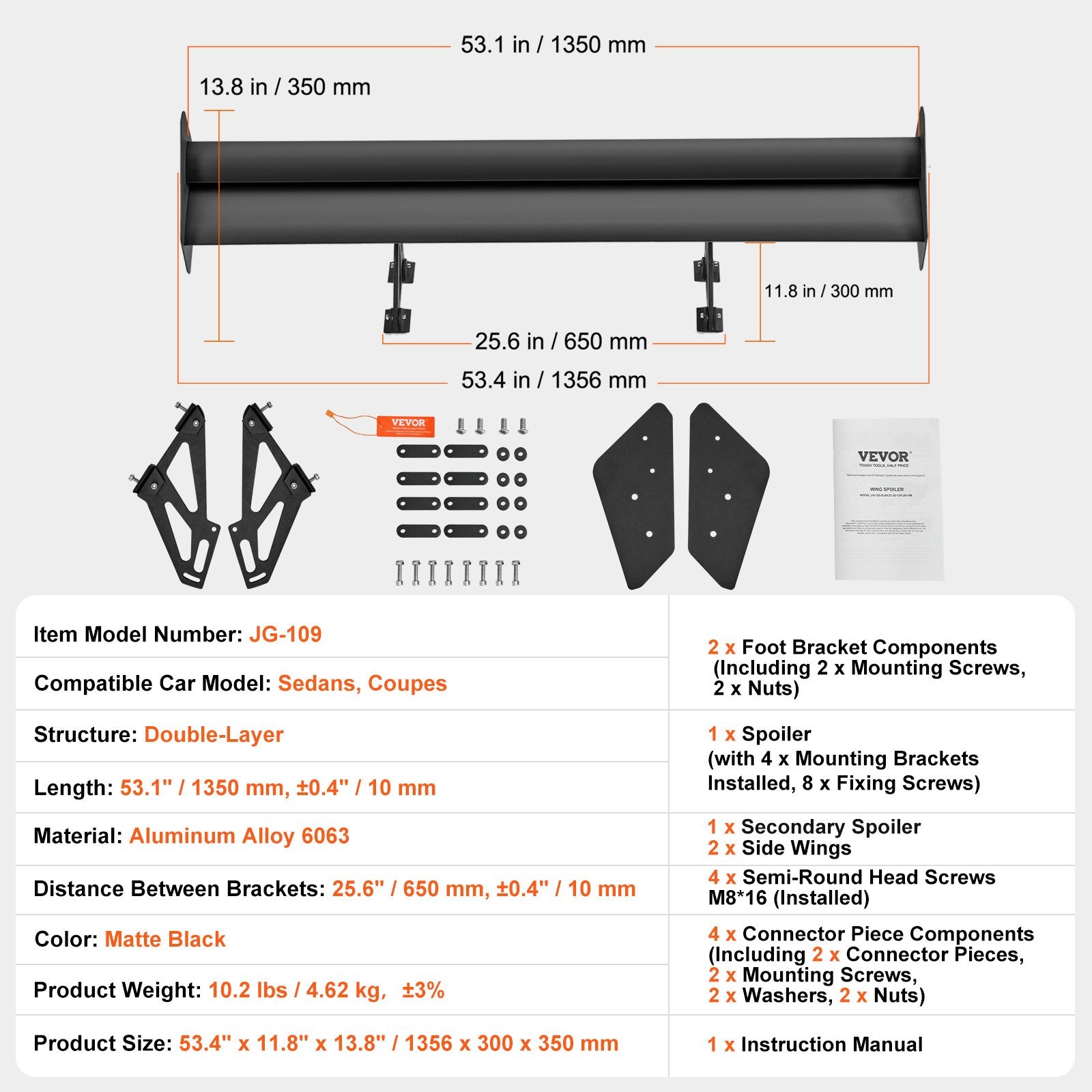 VEVOR GT Wing Car Spoiler, 53.1 inch Universal Spoiler with Double Deck, Adjustable